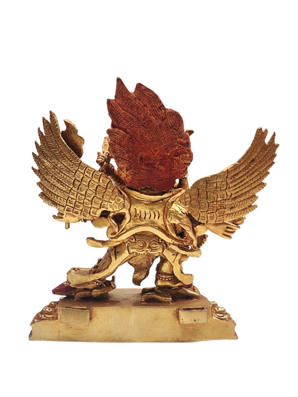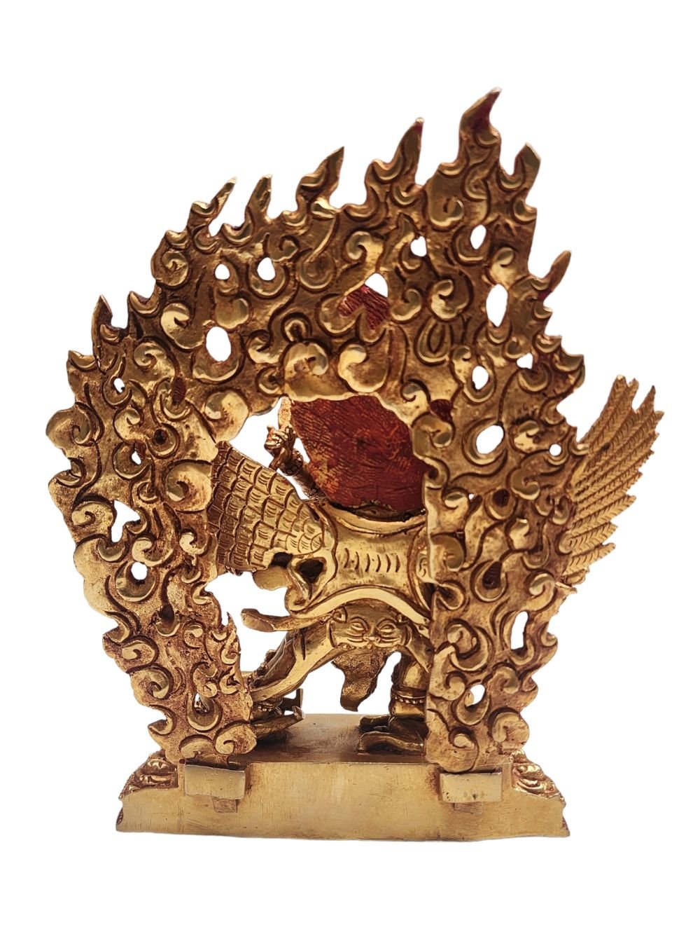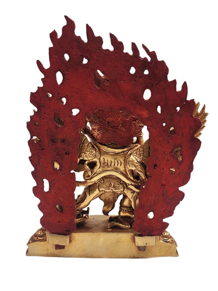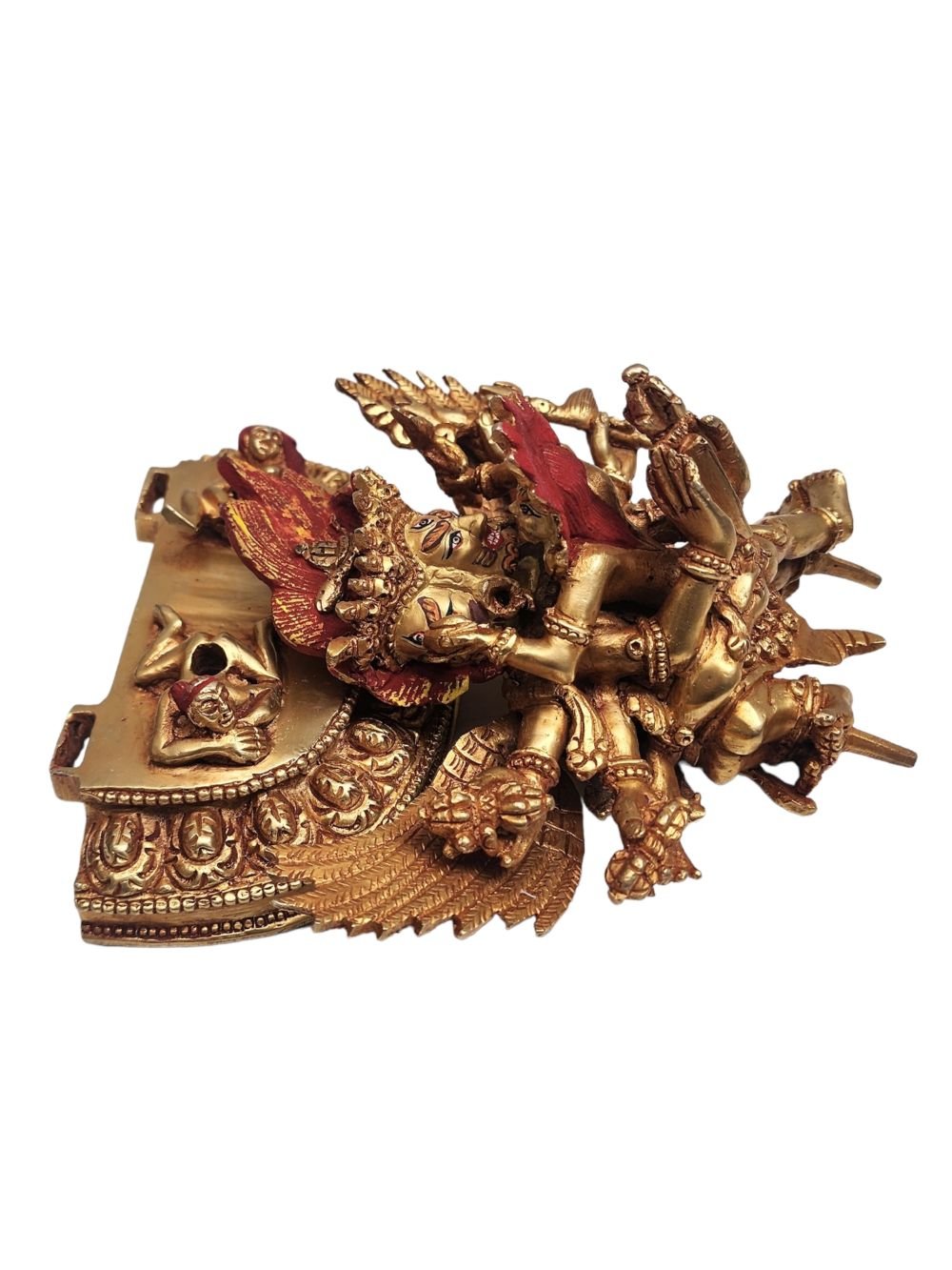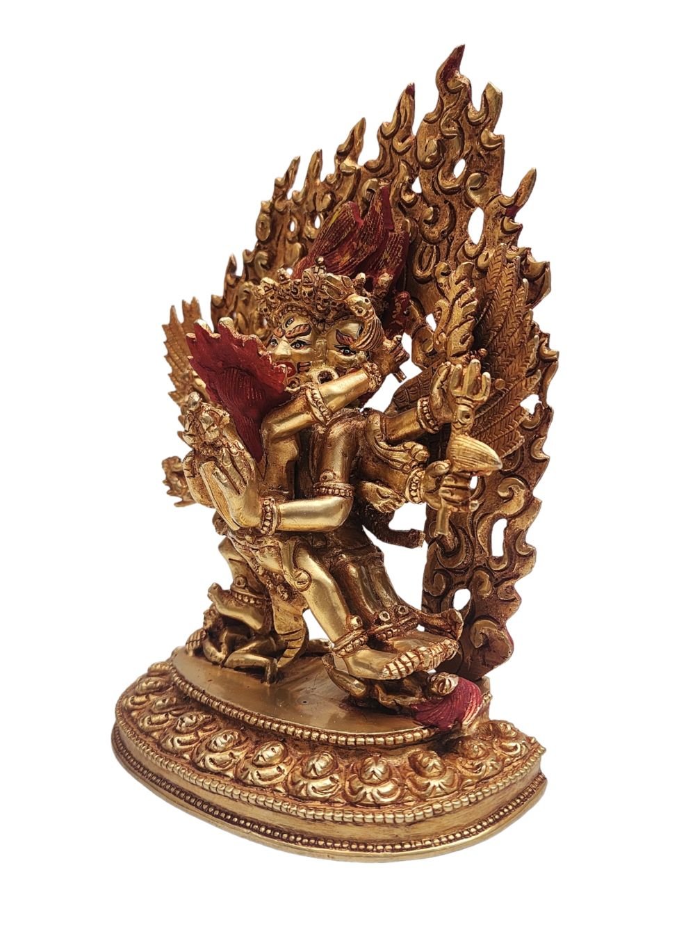 The face of Vajrakilaya is painted with gold to enhance its significant features, particularly the eyes, and lips. This detailed painting is essential as it brings forth the crucial attributes of the expression of eyes and lips that metal carving alone cannot capture.