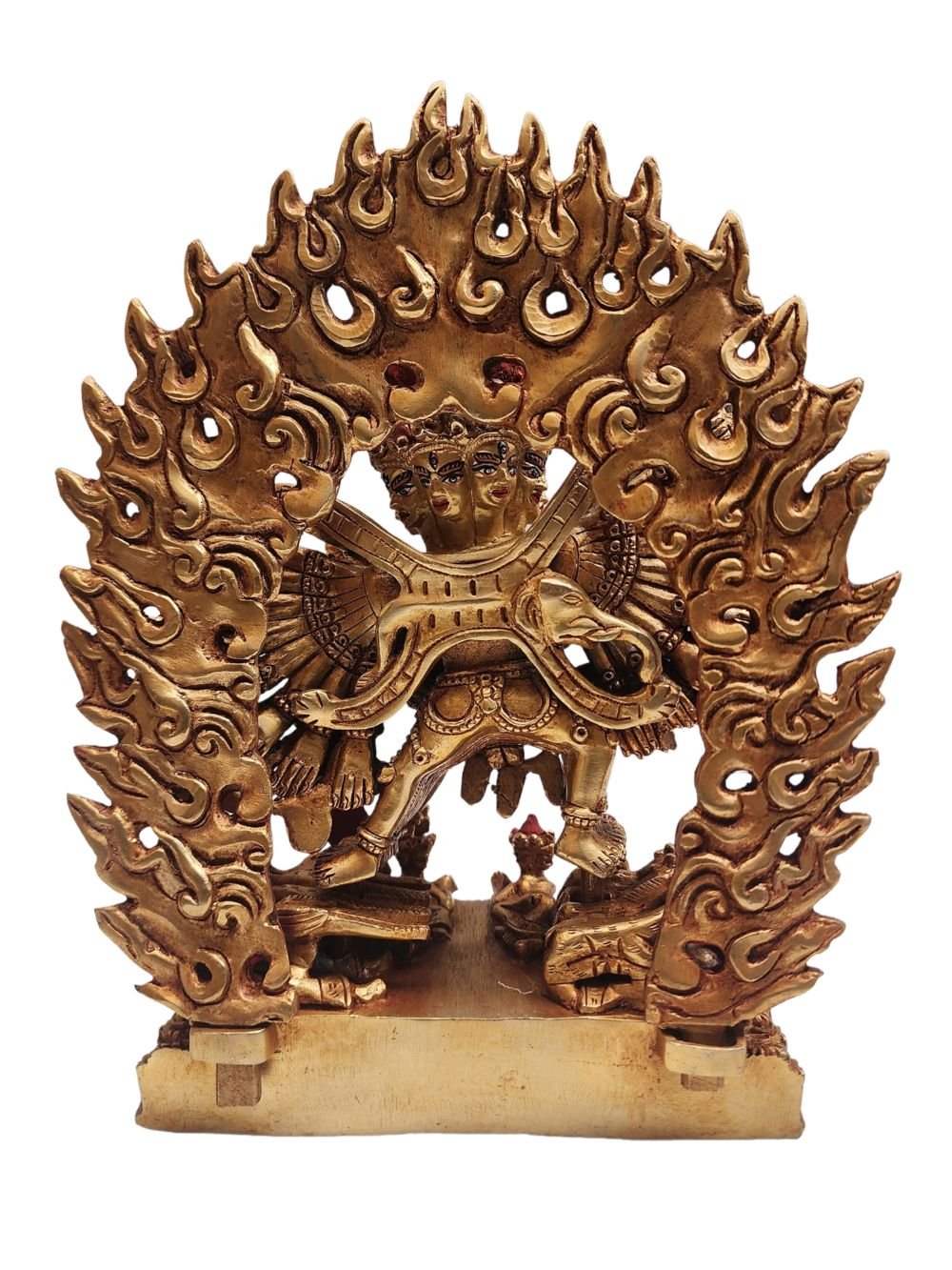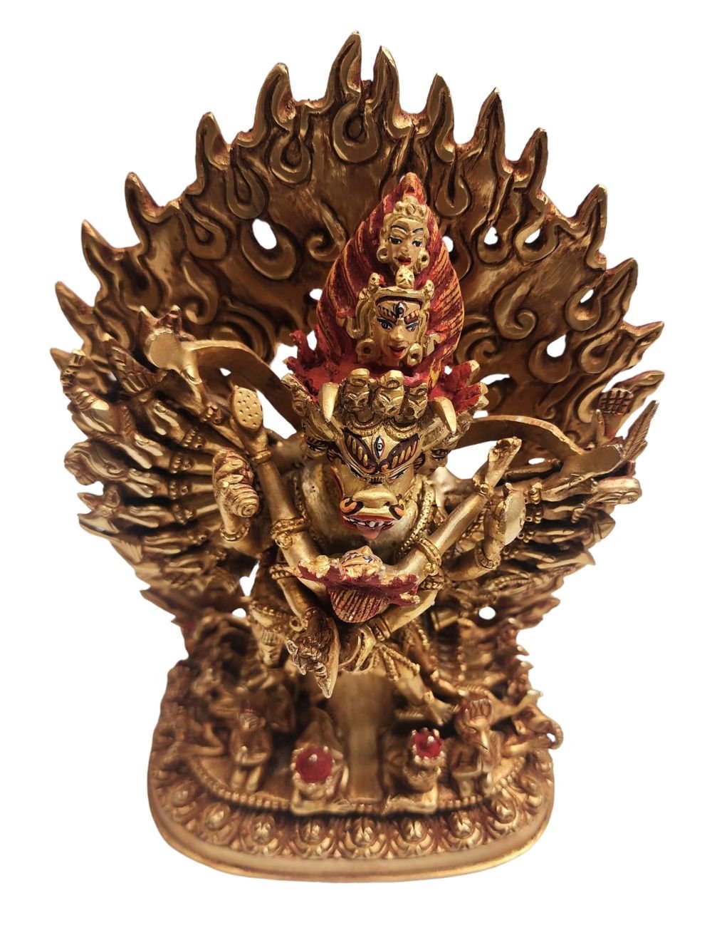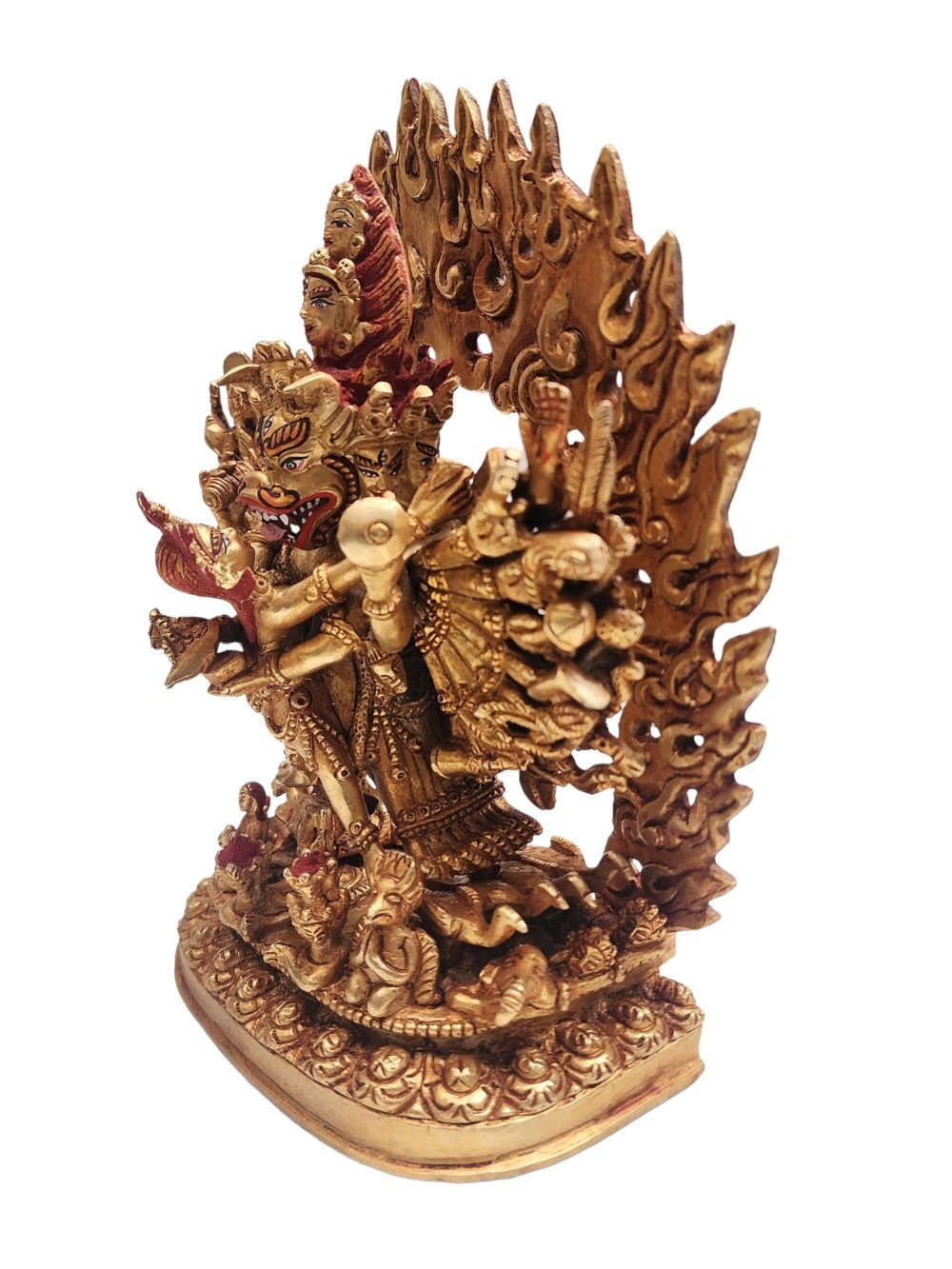 The face of Yamantaka is painted with gold to enhance its significant features, particularly the eyes, and lips. This detailed painting is essential as it brings forth the crucial attributes of the expression of eyes and lips that metal carving alone cannot capture.