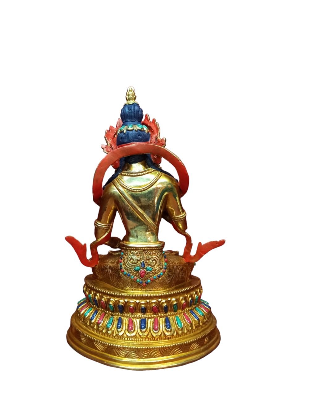 The Vajrasattva is adorned with an exquisite array of semi-precious stones, including turquoise, coral, and lapis lazuli. These stones are carefully selected and meticulously placed on the Vajrasattva's surface, adding a touch of opulence and enhancing its overall beauty. Each stone is thoughtfully positioned using a high-quality adhesive, ensuring secure and long-lasting attachment. The vibrant colors and unique patterns of the stones create a captivating contrast against the backdrop of the Vajrasattva, elevating its visual appeal and making it truly eye-catching. Read More