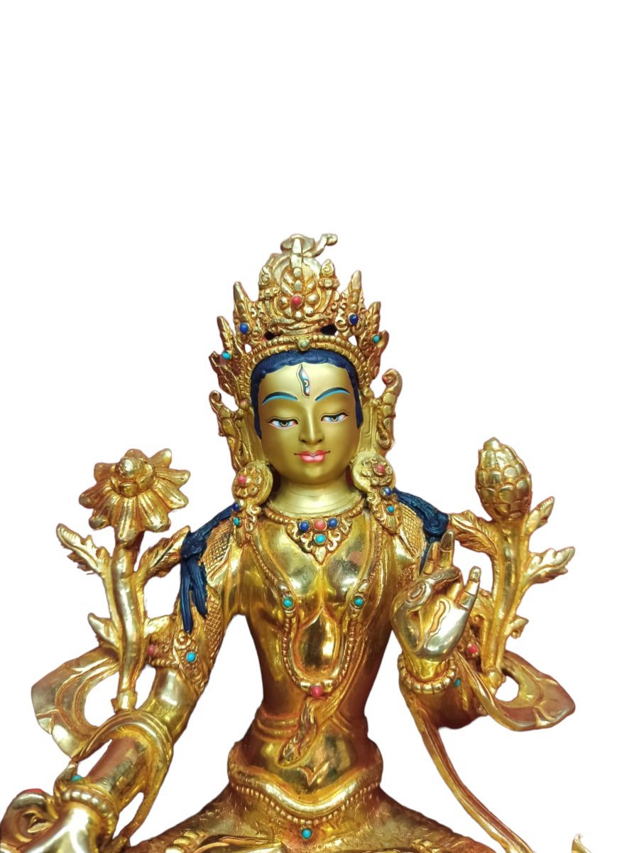 This White Tara is finished with full gold plating. also known as mercury gold plating or fire gold plating. This traditional technique involves the application of a genuine layer of gold onto the White Tara. Referred to as mercury gold plating, it is considered the correct and authentic form of gold plating in Nepal. Despite being more expensive than electroplating, this traditional mercury gold plating is gaining popularity again in Nepal. People are drawn to its authenticity, longevity, and the unmatched beauty it brings to the White Tara. The resurgence of interest in this traditional form of gold plating reflects a growing appreciation for the craftsmanship and cultural heritage of Nepal Read More