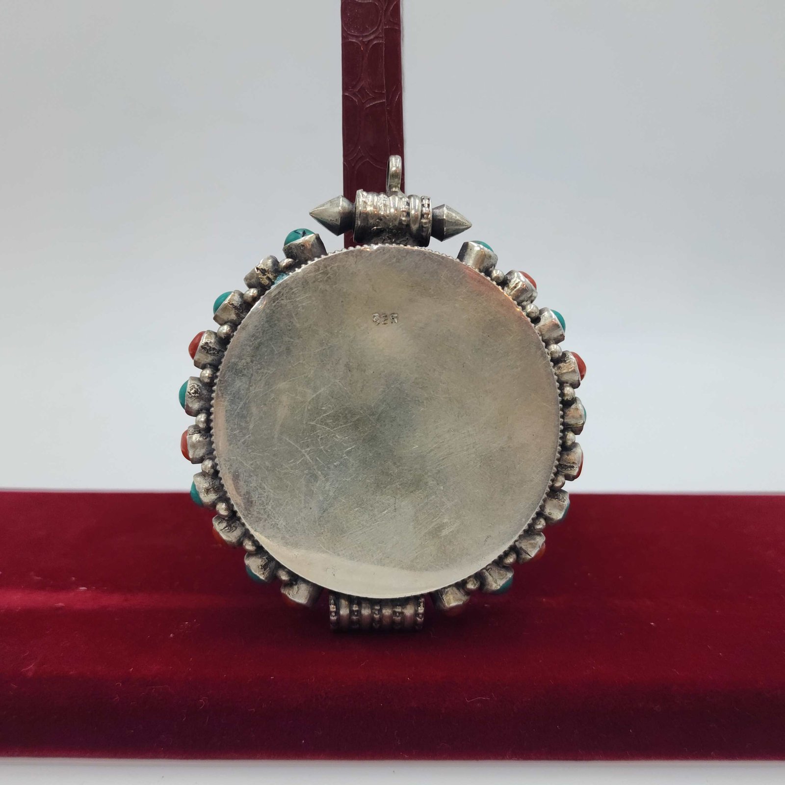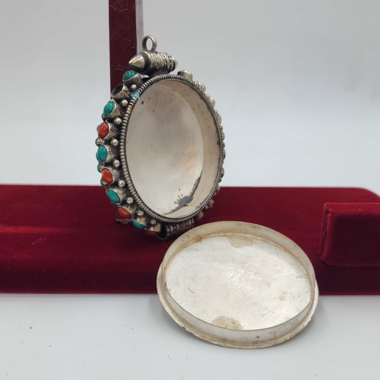 Sterlin Silver Tibetan Ghau Box with Flower Design, Stone Setting