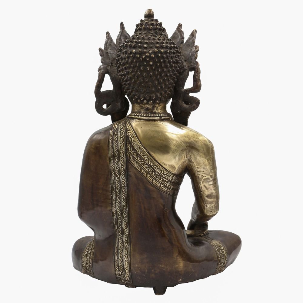 This Shakyamuni Buddha has been meticulously treated with a chocolate color antique patina. The intention behind this patina is to replicate the appearance of a copper statue that has gracefully aged over a century. Unlike a simple coat of paint, this patina is not applied superficially and is designed to endure. It undergoes an artificial oxidation process that adds depth and character, while also serving as a protective layer against natural oxidation.