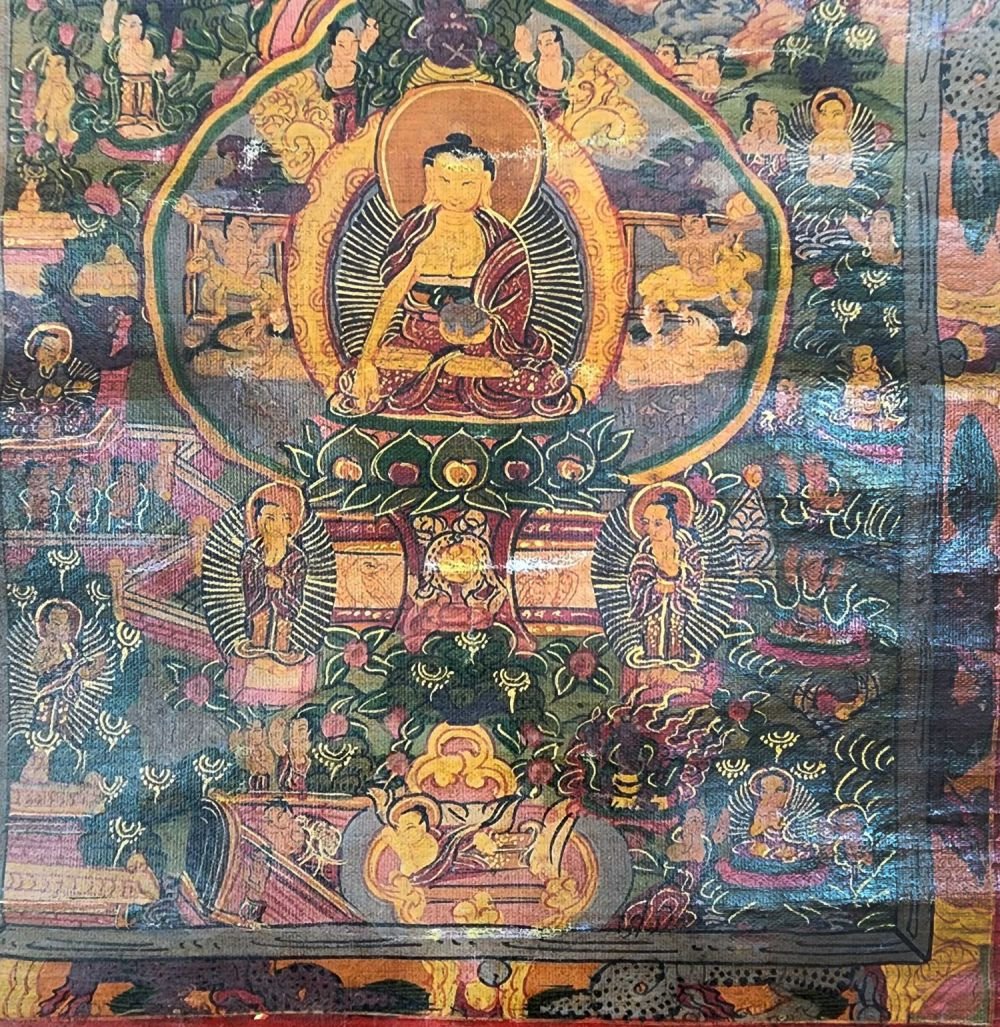 Buddhist Tibetan Thangka of Buddha Life Story, Hand Painted, Antique |