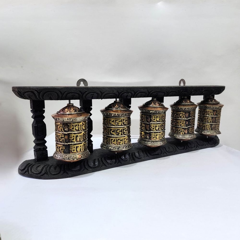 A prayer wheel is a cylindrical wheel on a spindle made from metal, wood, stone, leather, or coarse cotton. Traditionally, the mantra Om Mani Padme Hum is written in the Newari language of Nepal, on the outside of the wheel. Also sometimes depicted are Dakinis, Protectors, and very often the 8 auspicious symbols Ashtamangala. At the core of the cylinder is a "Life Tree" often made of wood or metal with certain mantras written on or wrapped around it. Many thousands (or in the case of larger prayer wheels, millions) of mantras are then wrapped around this life tree. The Mantra Om Mani Padme Hum is most commonly used, but other mantras may be used as well. According to the Tibetan Buddhist tradition based on the lineage texts regarding prayer wheels, spinning such a wheel will have much the same meritorious effect as orally reciting the prayers. Read More