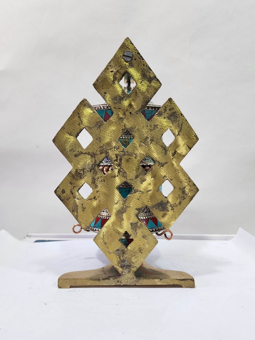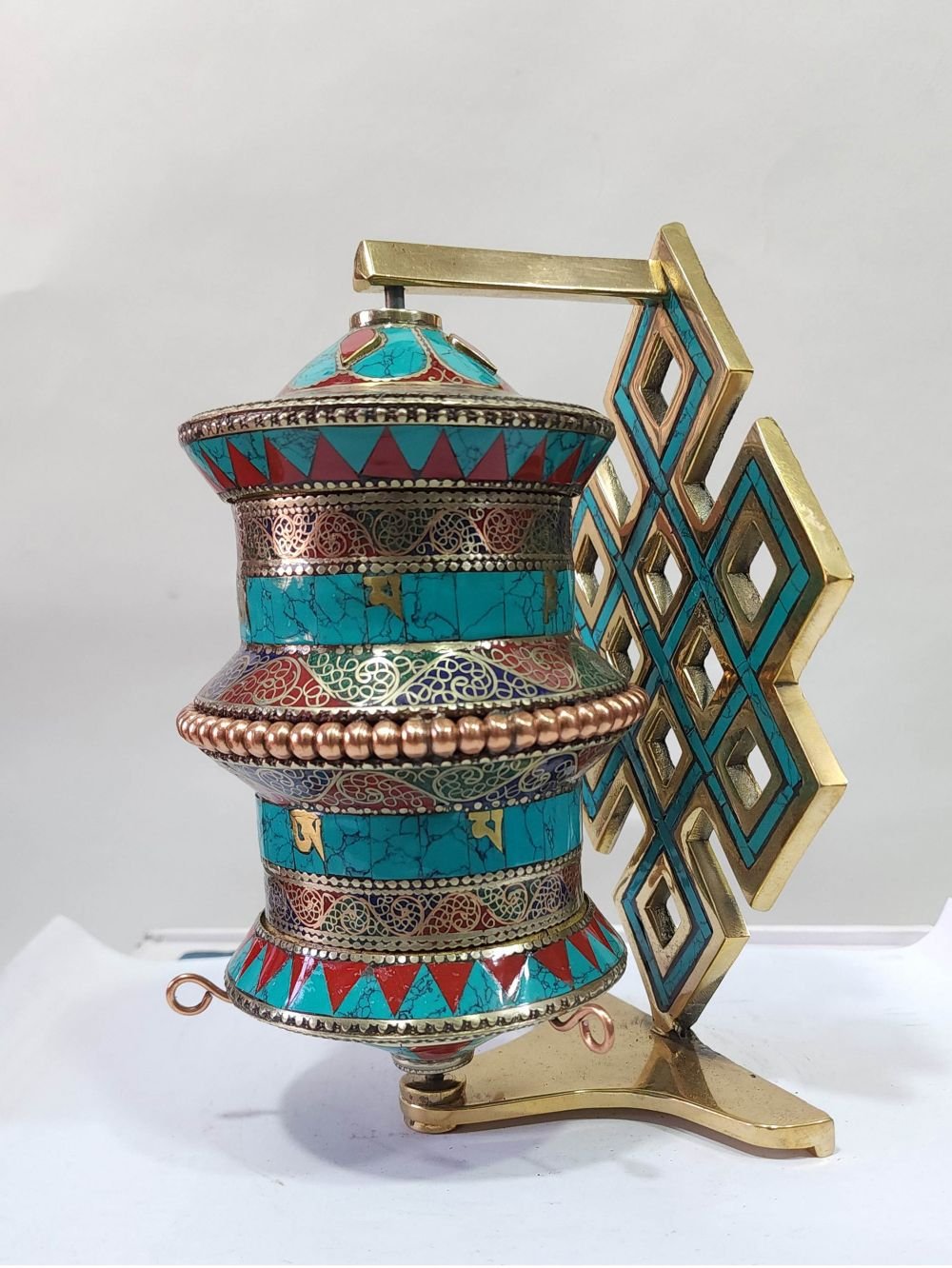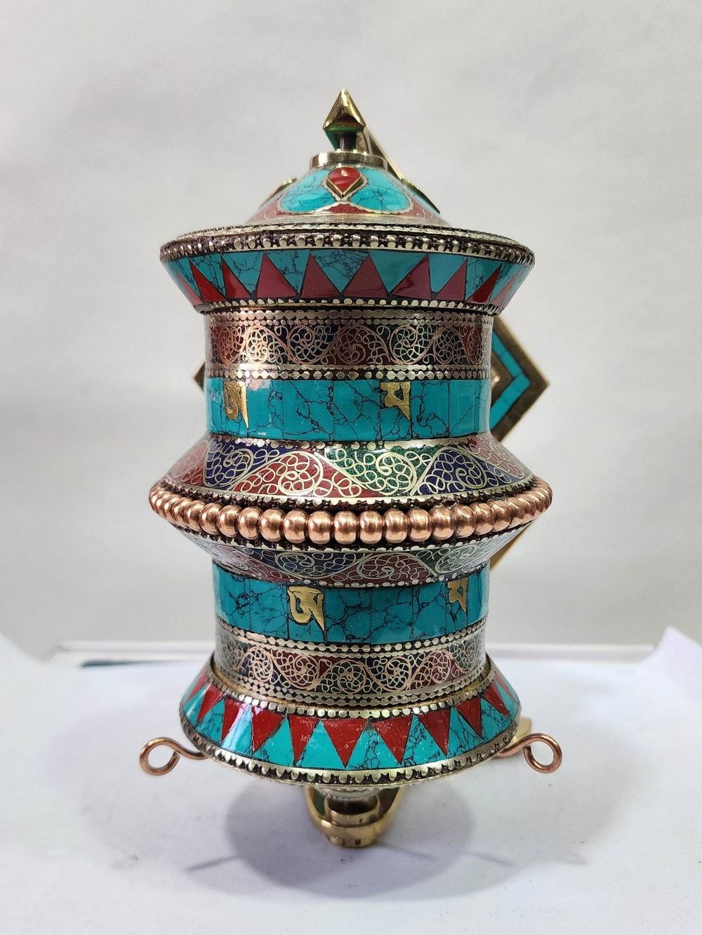 The Prayer Wheel is adorned with an exquisite array of semi-precious stones, including turquoise, coral, and lapis lazuli. These stones are carefully selected and meticulously placed on the Prayer Wheel's surface, adding a touch of opulence and enhancing its overall beauty. Each stone is thoughtfully positioned using a high-quality adhesive, ensuring secure and long-lasting attachment. The vibrant colors and unique patterns of the stones create a captivating contrast against the backdrop of the Prayer Wheel, elevating its visual appeal and making it truly eye-catching. Read More