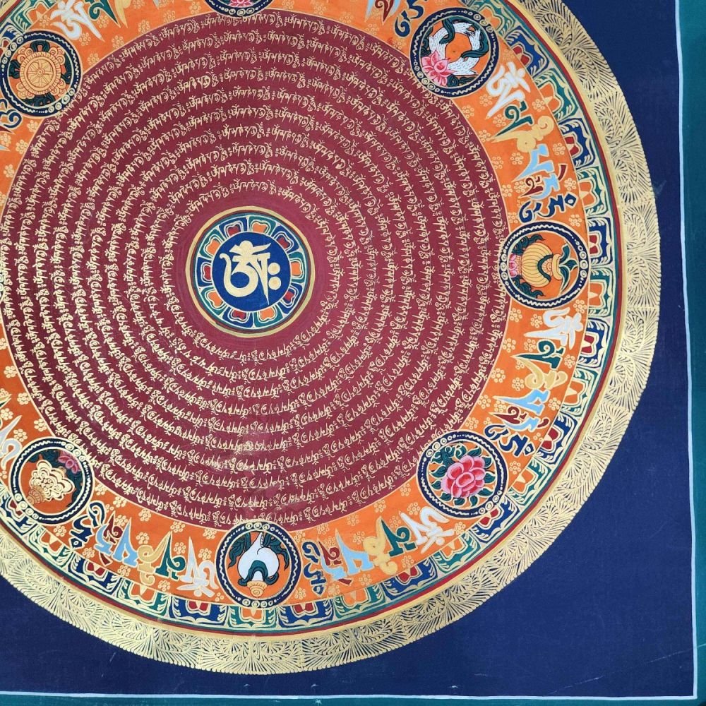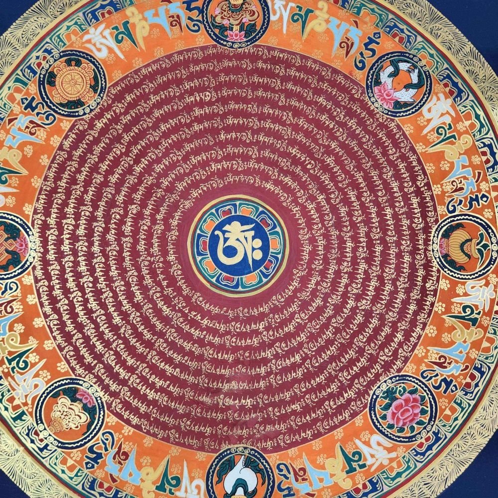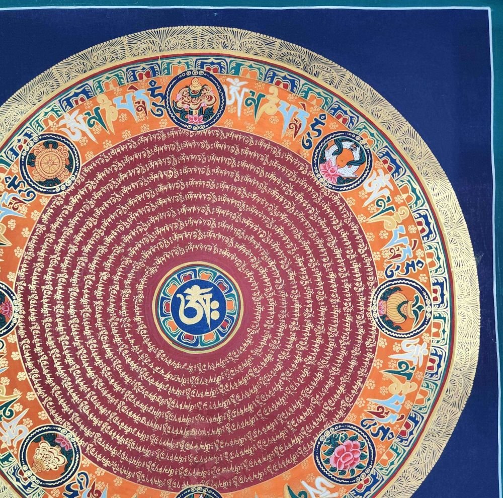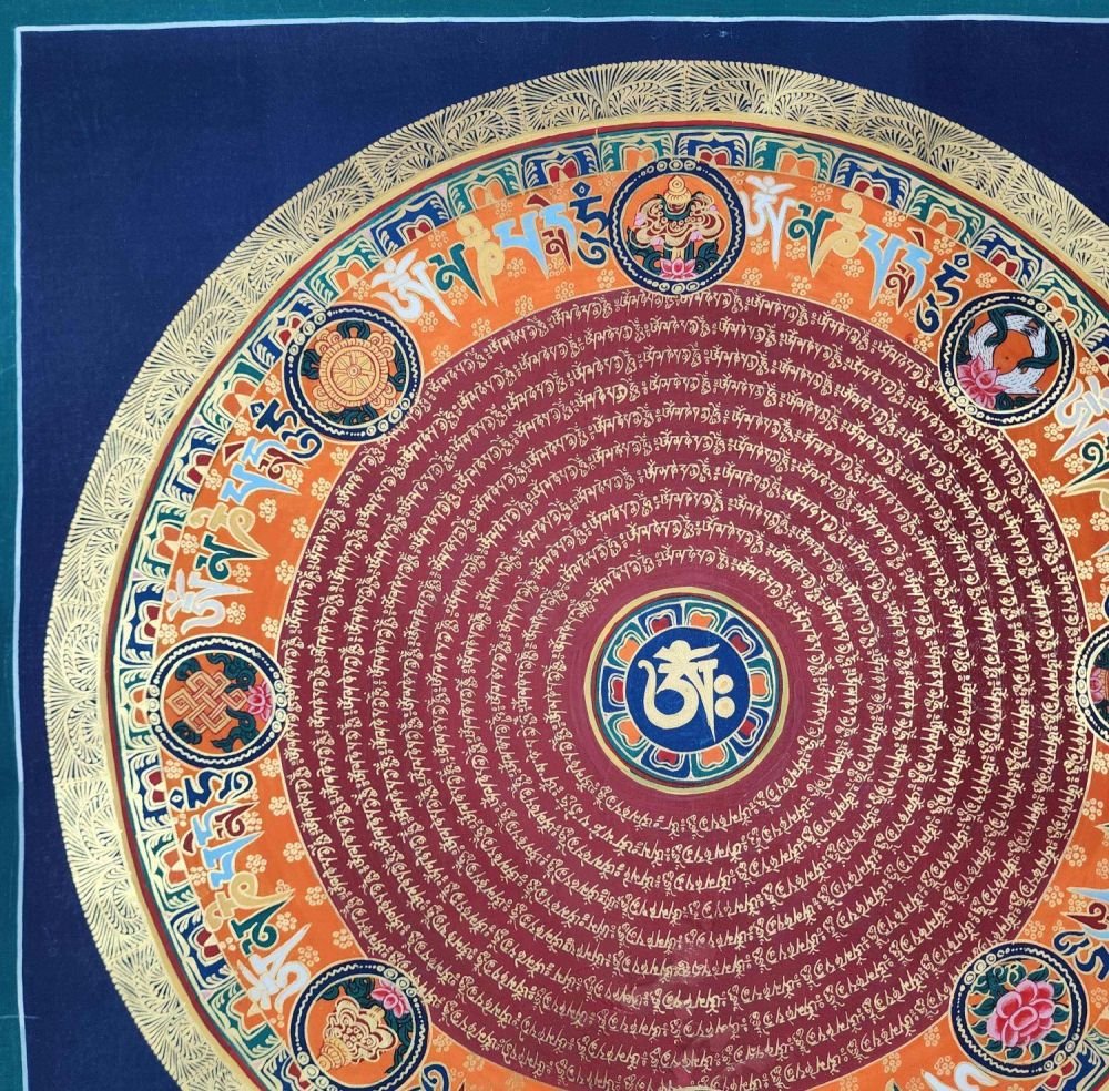 OM MANI PADME HUM is also inscribed in Mandala paintings. Those kinds of mandala have OM MANI PADME HUM in a circular fashion, and mantras are painted in concentric circles from the surface to the center of the circle. They come under the categories of the Mantra Mandala. These mandalas are usually found hanging on the walls of Buddhist monasteries and are often used in meditation halls for focus and concentration purposes.