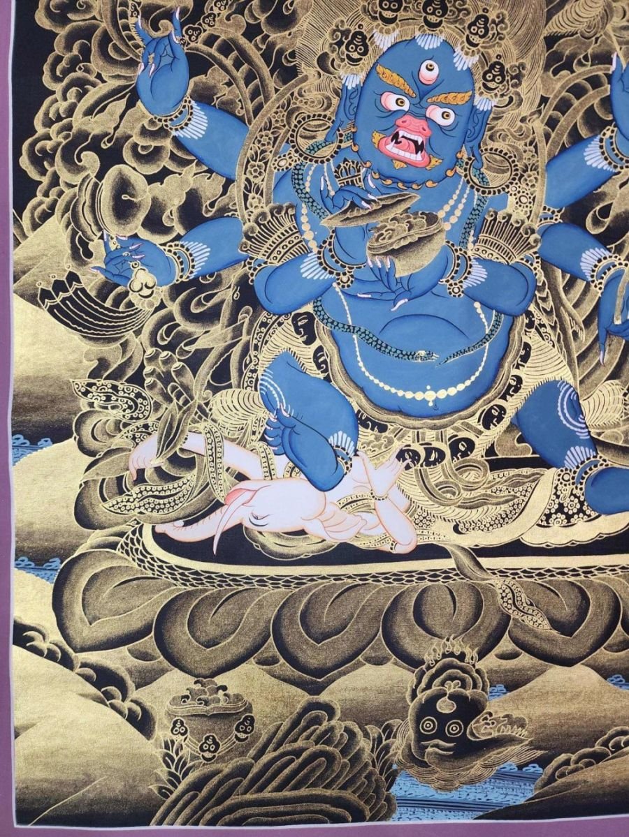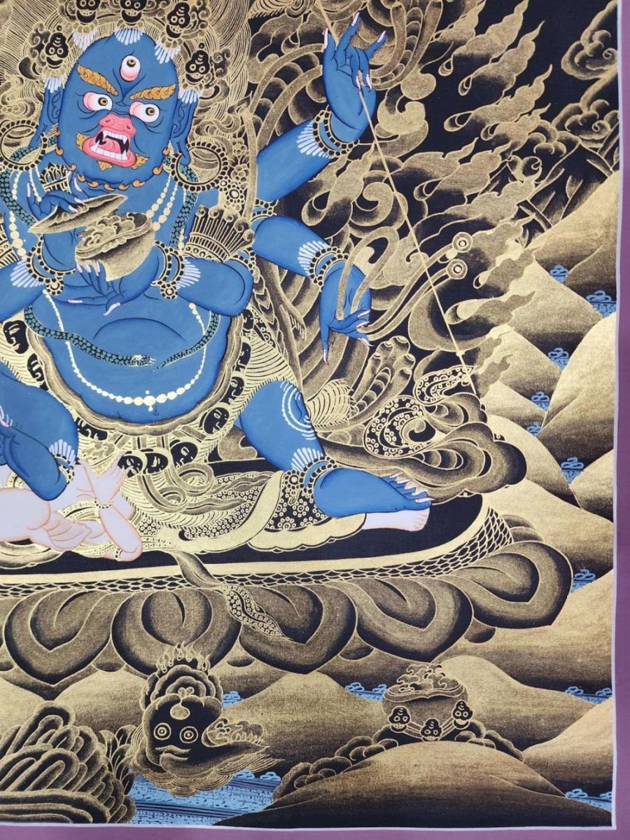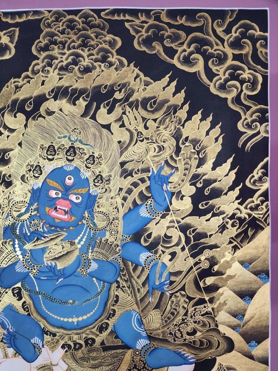 Buddhist Handmade Thangka of Black Mahakala, Hand Painted , Fierce protector, destroys obstacles, guards the Dharma