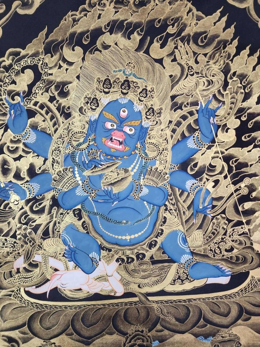Black Mahakala is typically depicted with a fierce expression, dark blue or black, symbolizing his wrathful nature. He stands on a corpse, representing his triumph over death and impermanence. He has four arms, each holding a symbolic object. His main right hand wields a trident, representing his power over the three poisons of ignorance, attachment, and aversion. In his main left hand, he holds a skull cup filled with blood, symbolizing the transmutation of negative emotions. His remaining two hands hold a curved knife, representing the severance of ignorance, and a lasso, symbolizing the binding of negative forces.