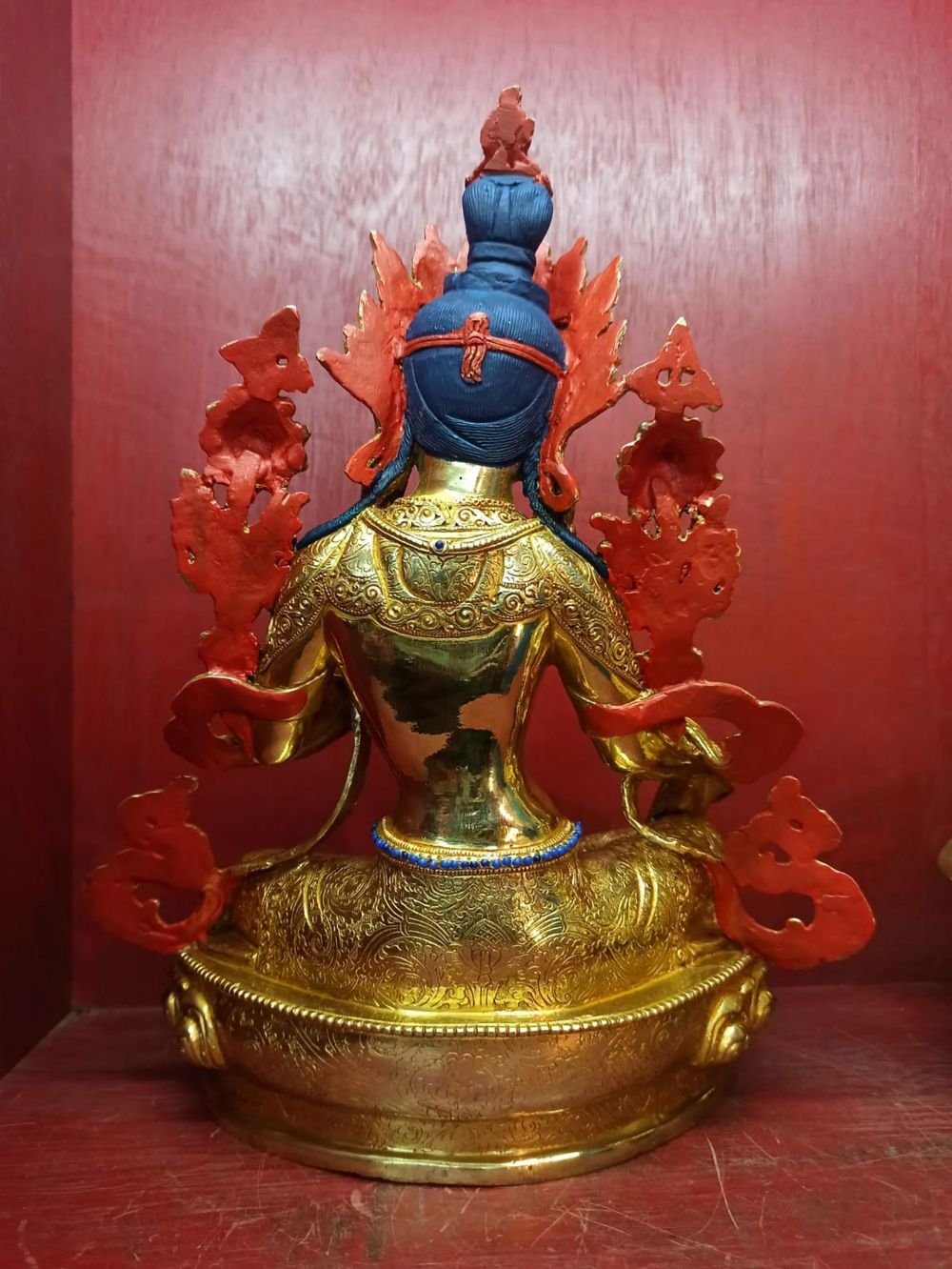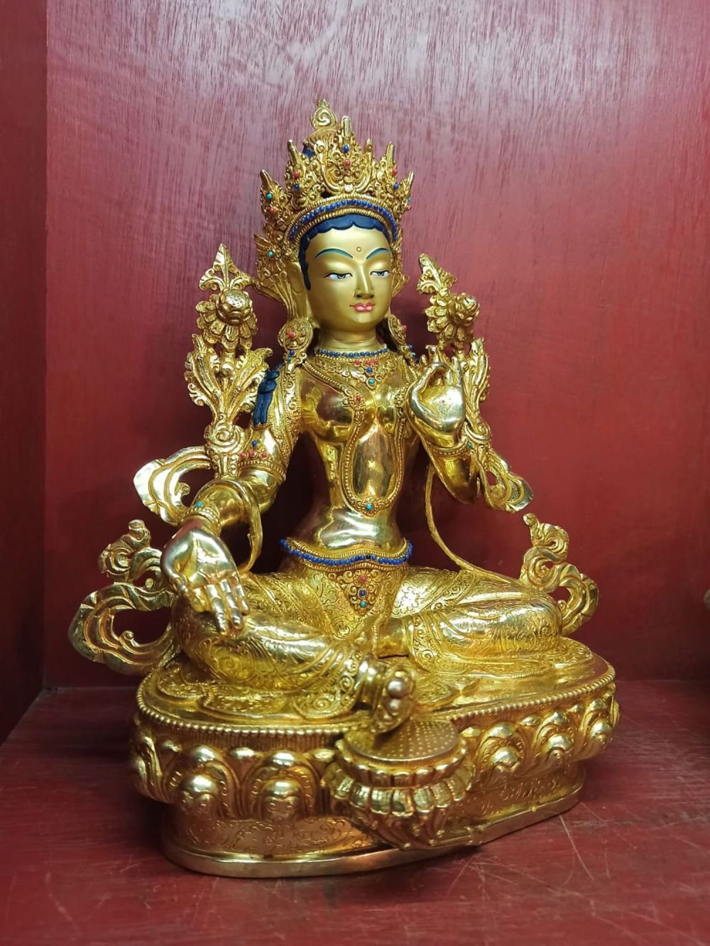 This Green Tara is finished with full gold plating. also known as mercury gold plating or fire gold plating. This traditional technique involves the application of a genuine layer of gold onto the Green Tara. Referred to as mercury gold plating, it is considered the correct and authentic form of gold plating in Nepal. Despite being more expensive than electroplating, this traditional mercury gold plating is gaining popularity again in Nepal. People are drawn to its authenticity, longevity, and the unmatched beauty it brings to the Green Tara. The resurgence of interest in this traditional form of gold plating reflects a growing appreciation for the craftsmanship and cultural heritage of Nepal Read More