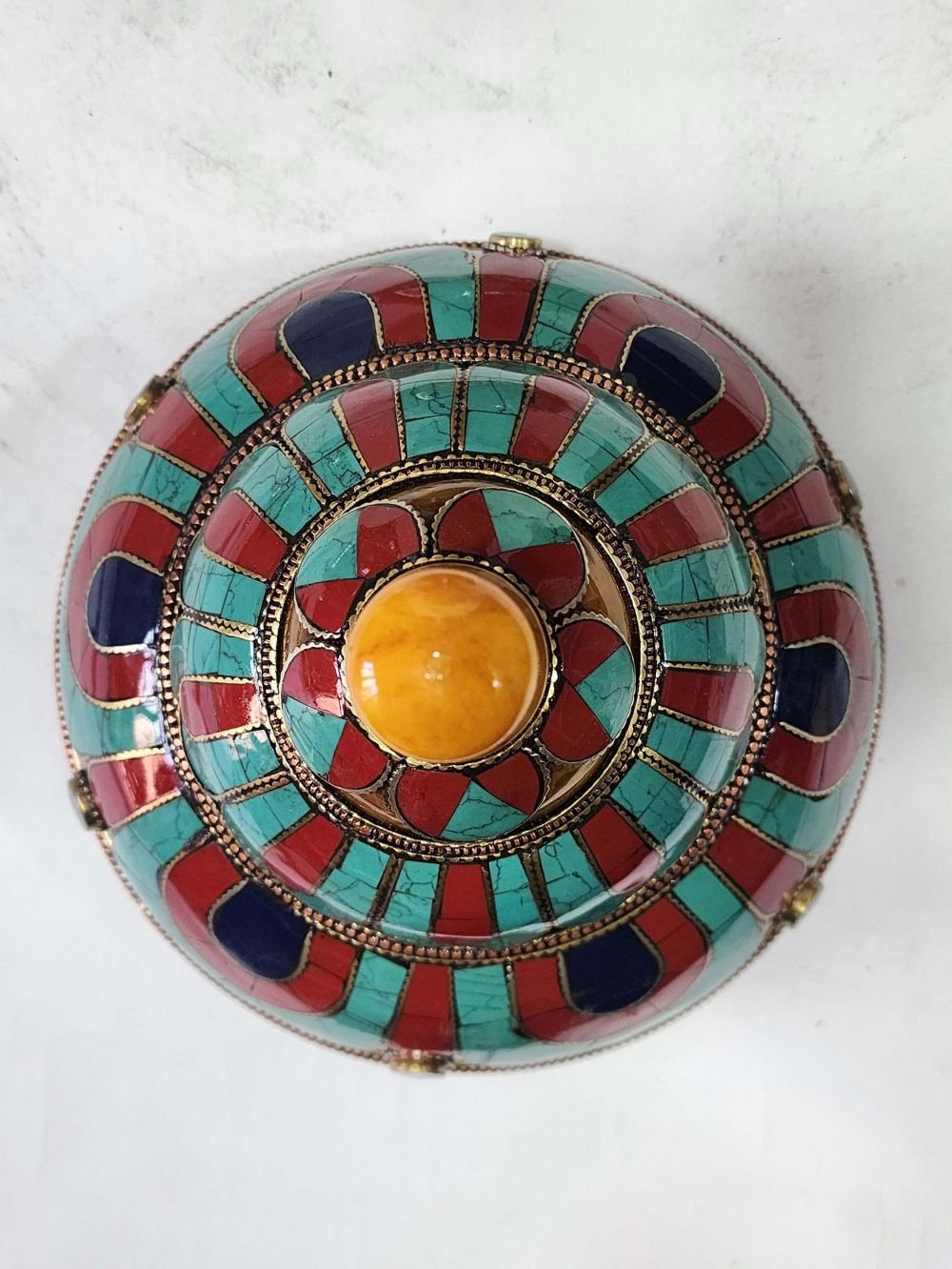 The Stupa Box is adorned with an exquisite array of semi-precious stones, including turquoise, coral, and lapis lazuli. These stones are carefully selected and meticulously placed on the Stupa Box's surface, adding a touch of opulence and enhancing its overall beauty. Each stone is thoughtfully positioned using a high-quality adhesive, ensuring secure and long-lasting attachment. The vibrant colors and unique patterns of the stones create a captivating contrast against the backdrop of the Stupa Box, elevating its visual appeal and making it truly eye-catching. Read More