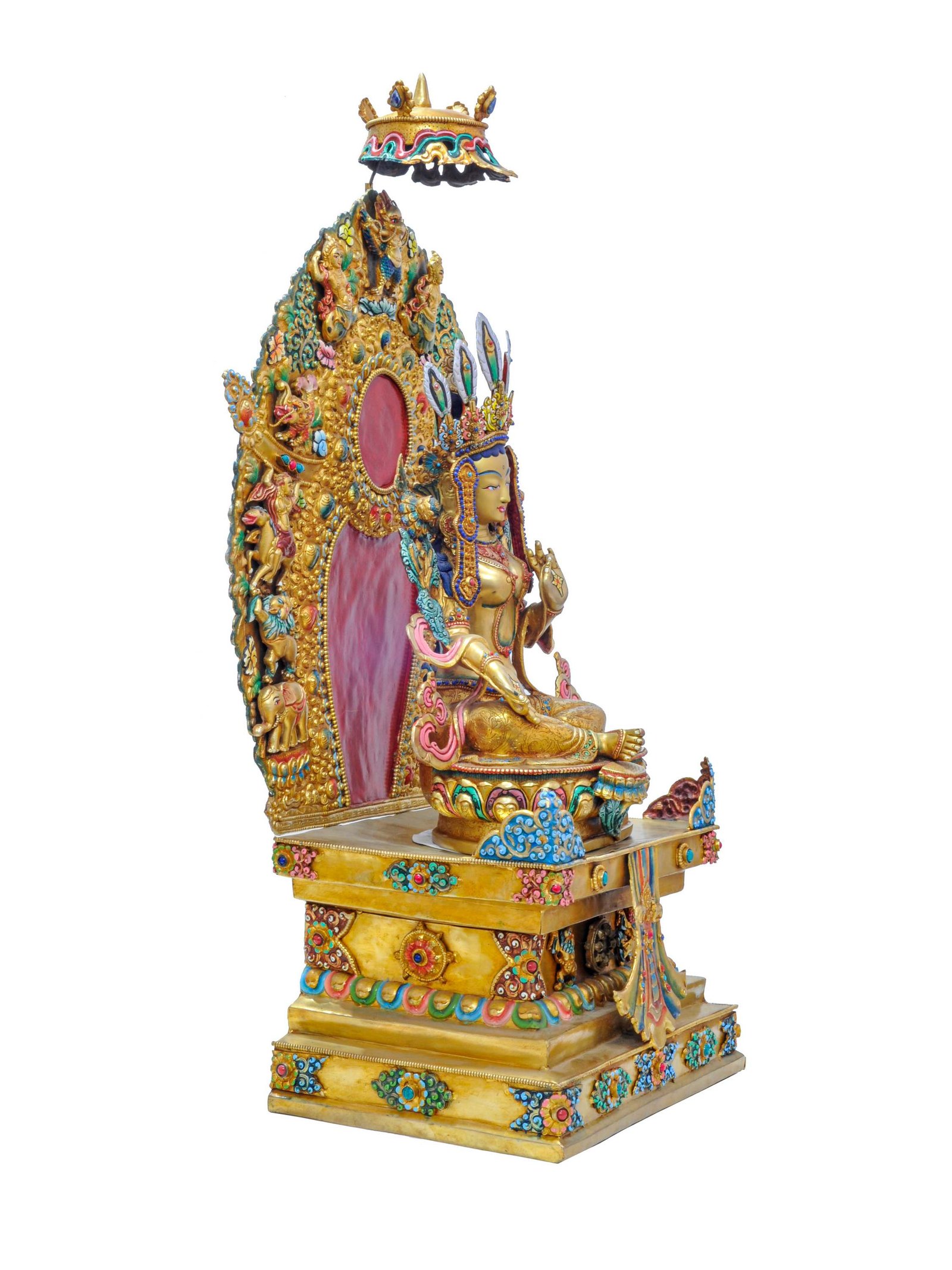 Buddhist Handmade Statue of Green Tara Sitting On Throne, Full Fire Gold Plated, Face Painted, Stone Setting , Goddess of Compassion, Protection, and Swift Action