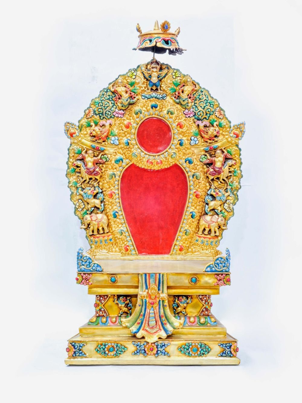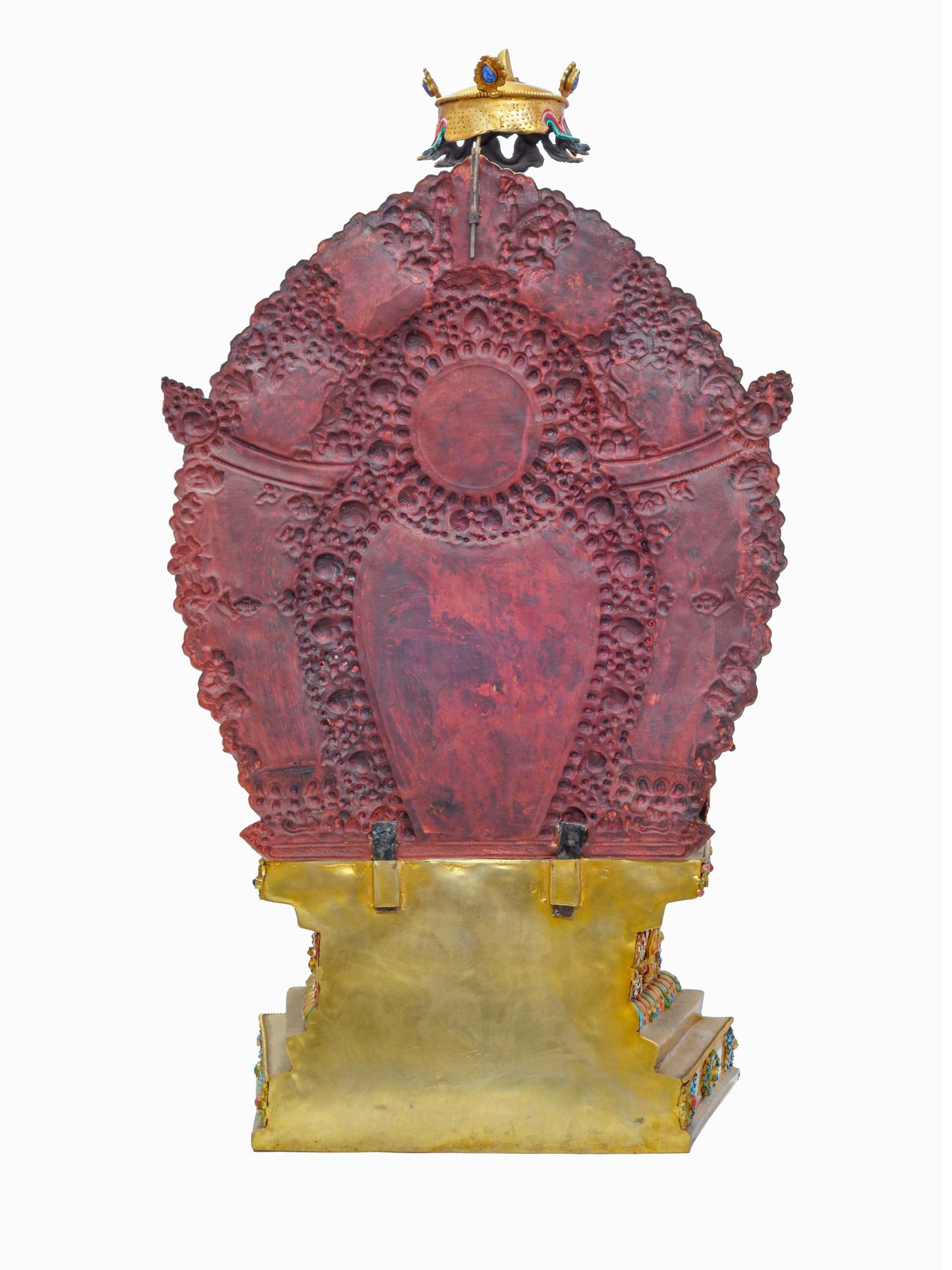 The face of Green Tara is painted with gold to enhance its significant features, particularly the eyes, and lips. This detailed painting is essential as it brings forth the crucial attributes of the expression of eyes and lips that metal carving alone cannot capture.