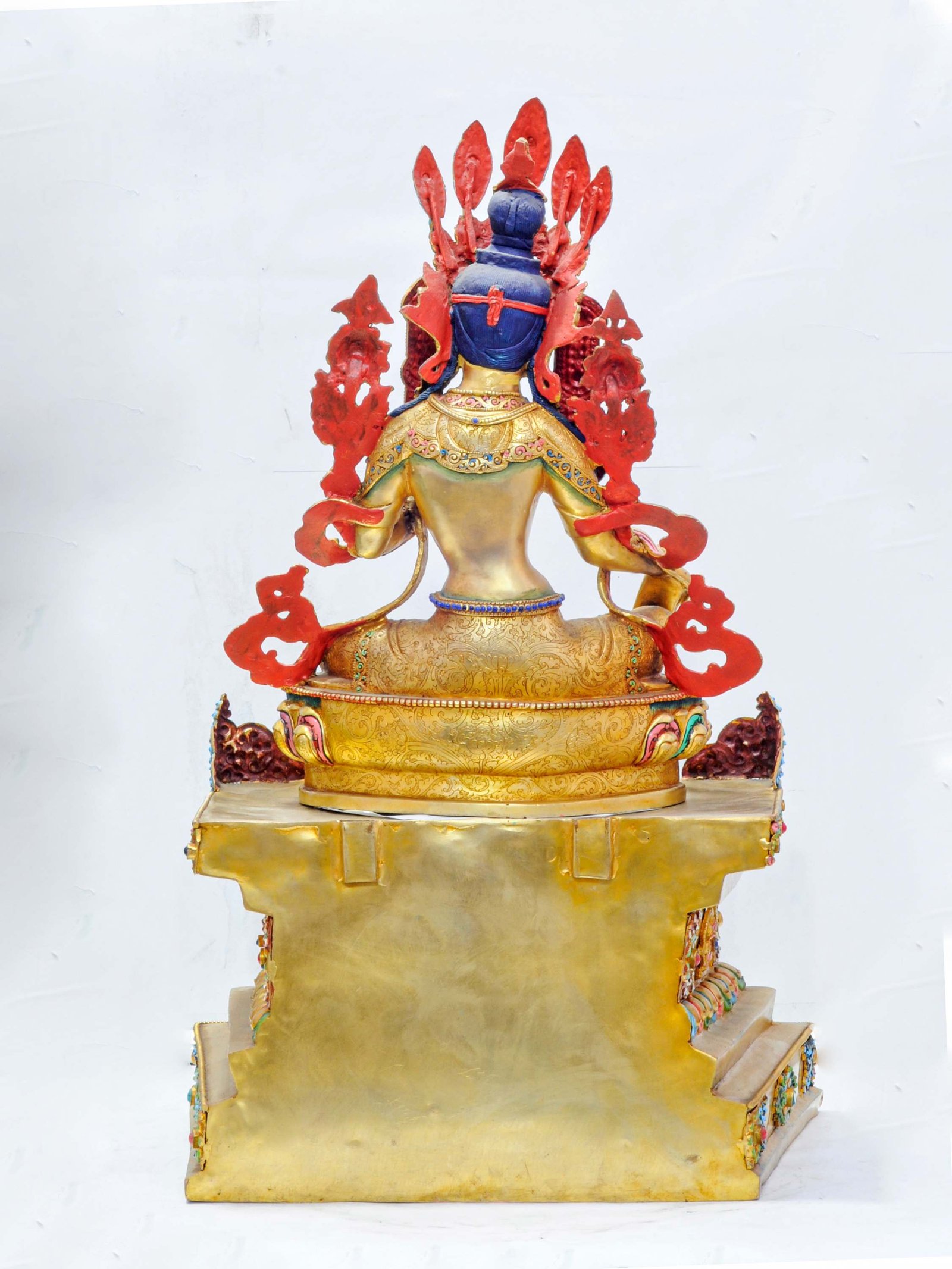 This Green Tara is finished with full gold plating. also known as mercury gold plating or fire gold plating. This traditional technique involves the application of a genuine layer of gold onto the Green Tara. Referred to as mercury gold plating, it is considered the correct and authentic form of gold plating in Nepal. Despite being more expensive than electroplating, this traditional mercury gold plating is gaining popularity again in Nepal. People are drawn to its authenticity, longevity, and the unmatched beauty it brings to the Green Tara. The resurgence of interest in this traditional form of gold plating reflects a growing appreciation for the craftsmanship and cultural heritage of Nepal Read More