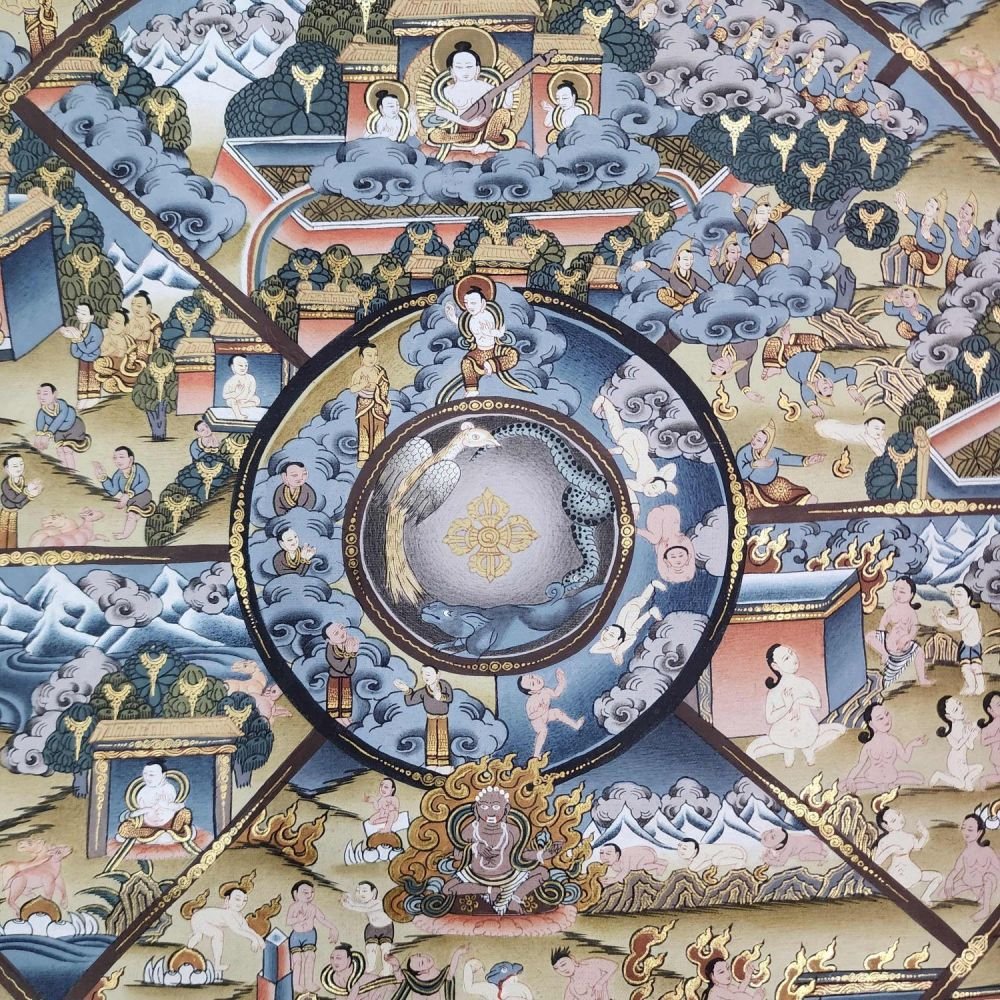 The outer rim of the wheel is divided into twelve sections that represent the Twelve Links of Dependent Origination.