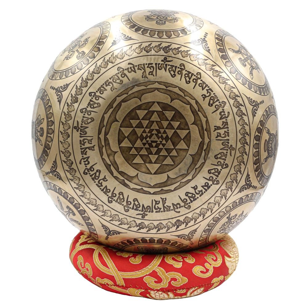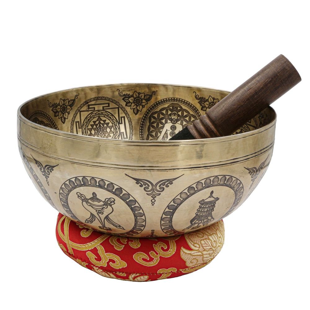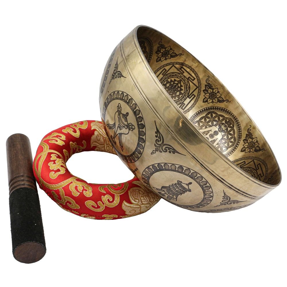 Buddhist Hand Beaten Jambati Singing Bowl, with Premium Etching Carving of Astrology,Planets and Yoga Man, Select Accessories |