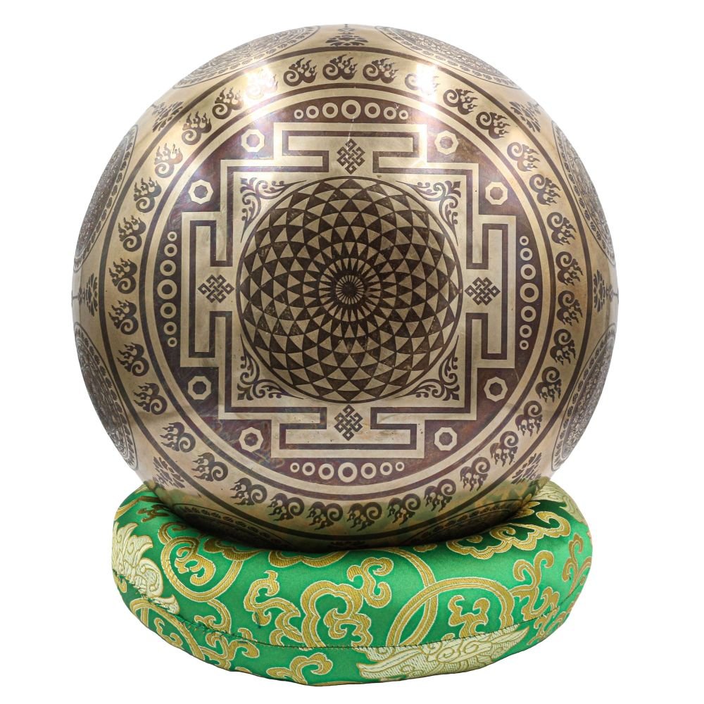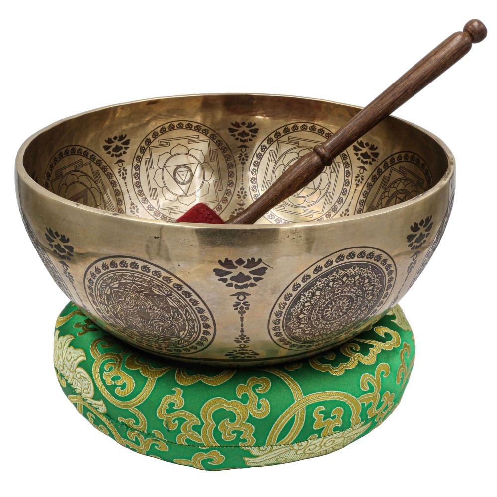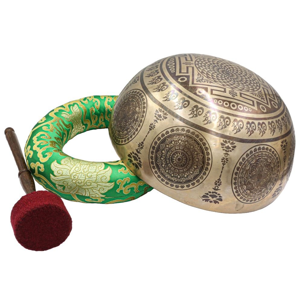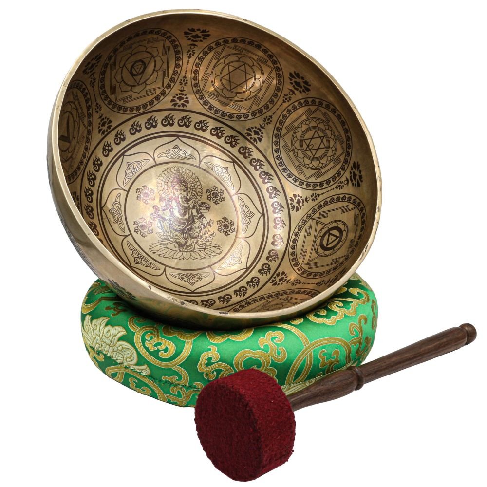 Buddhist Hand Beaten Jambati Singing Bowl, with Premium Etching Carving of Ganesh, Select Accessories |