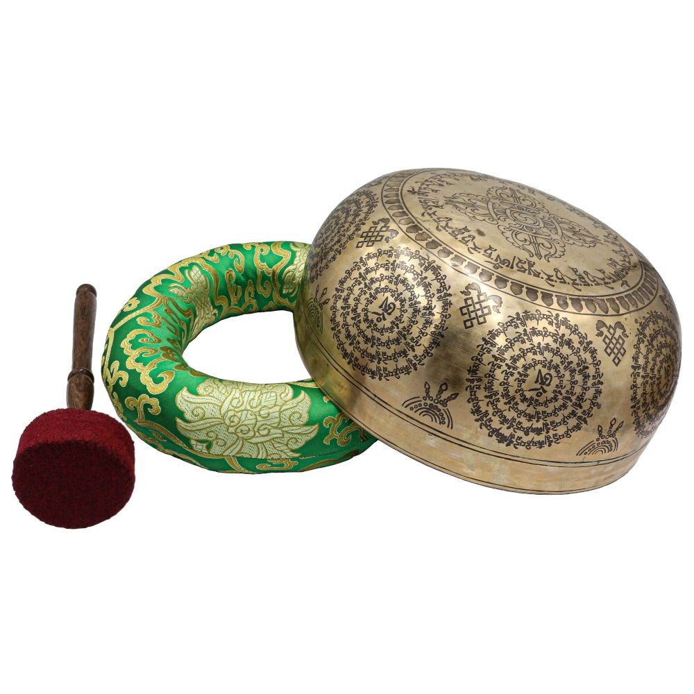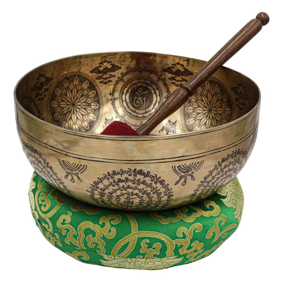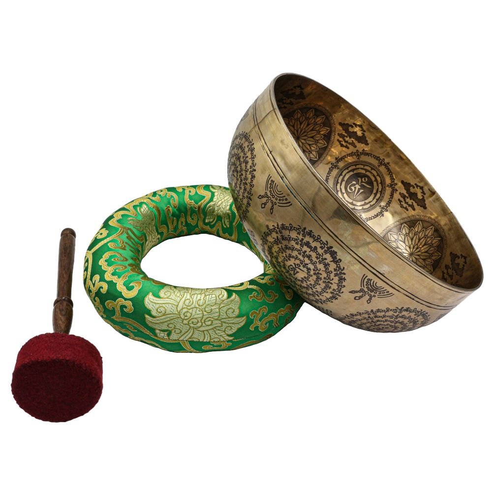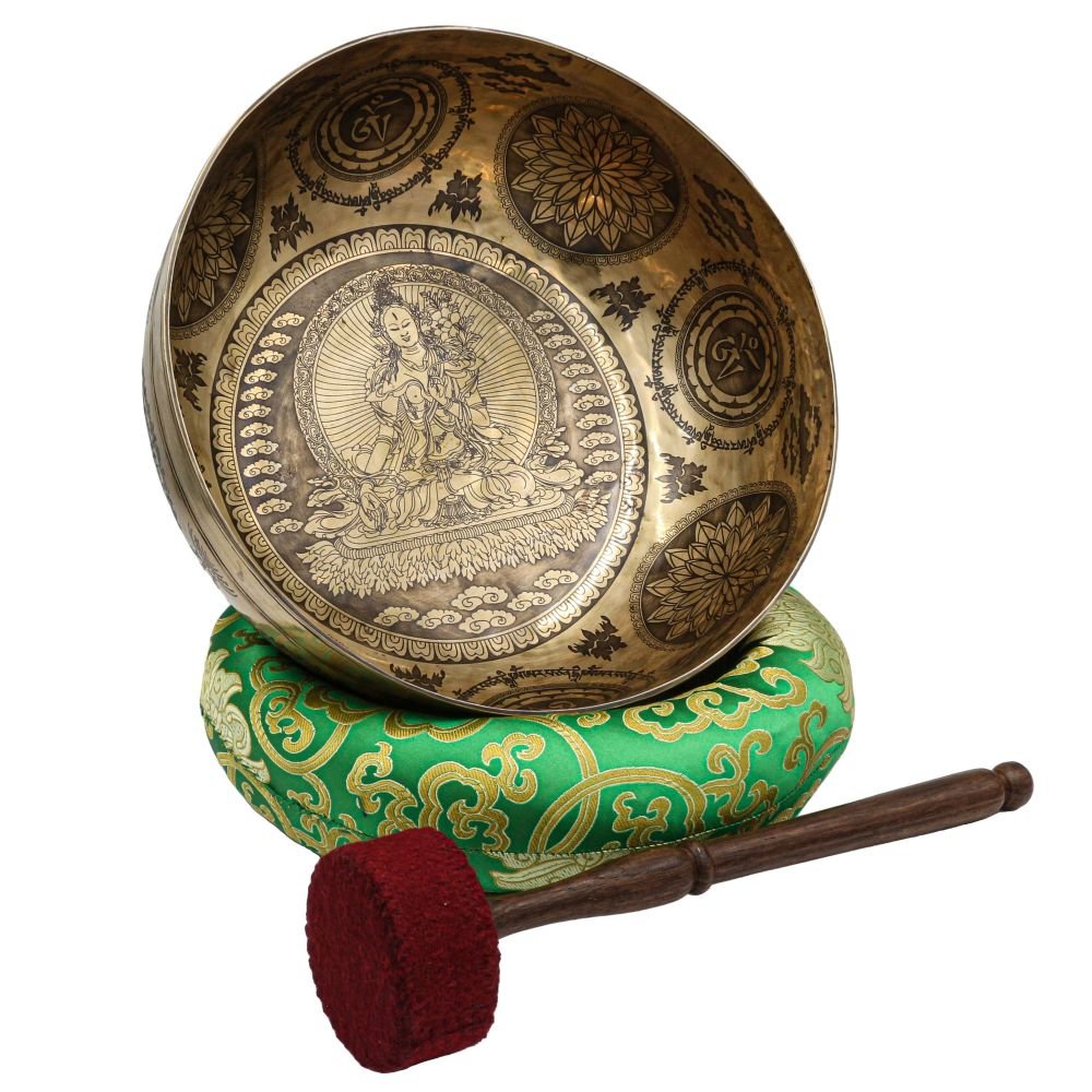 Buddhist Hand Beaten Jambati Singing Bowl, with Premium Etching Carving of White Tara, Select Accessories |