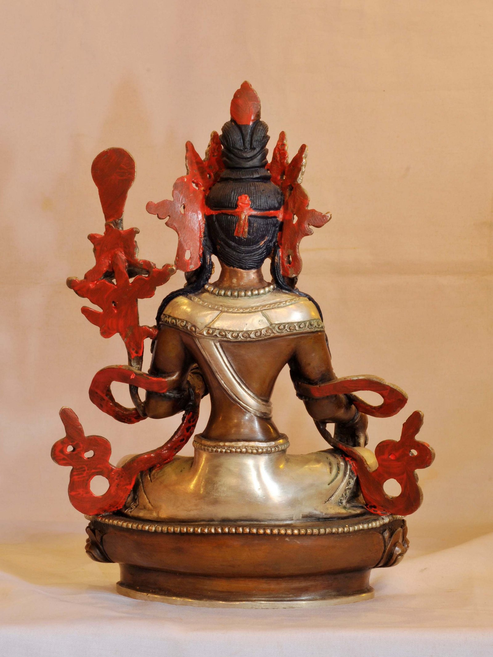This 21 Tara is made by the process of the Lost-Wax system. The lost-wax process, also known as investment casting, is a time-honored technique used to create metal sculptures. It involves several steps that have been practiced for thousands of years. Skilled artisans begin by sculpting a detailed wax model, capturing every intricate detail of the desired sculpture. The wax model is then coated with a ceramic shell, formed by multiple layers of ceramic material. Once the shell has cured, the wax is melted and drained out, leaving behind a cavity. Molten metal is poured into the cavity, creating a precise replica of the original wax model. After the metal has cooled and solidified, the ceramic shell is carefully removed, revealing the final metal sculpture. Read More