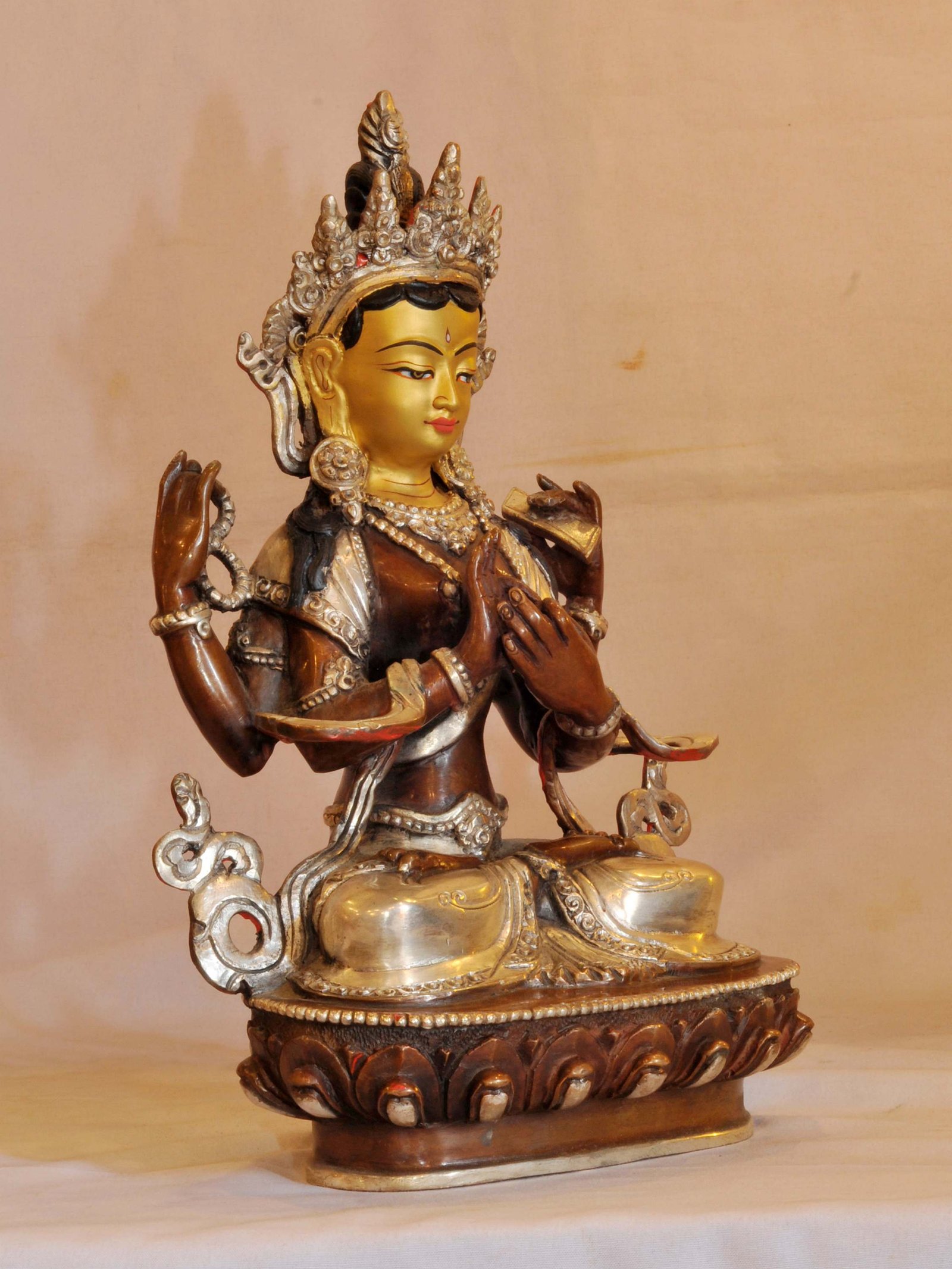 This Chenrezig is made by the process of the Lost-Wax system. The lost-wax process, also known as investment casting, is a time-honored technique used to create metal sculptures. It involves several steps that have been practiced for thousands of years. Skilled artisans begin by sculpting a detailed wax model, capturing every intricate detail of the desired sculpture. The wax model is then coated with a ceramic shell, formed by multiple layers of ceramic material. Once the shell has cured, the wax is melted and drained out, leaving behind a cavity. Molten metal is poured into the cavity, creating a precise replica of the original wax model. After the metal has cooled and solidified, the ceramic shell is carefully removed, revealing the final metal sculpture. Read More