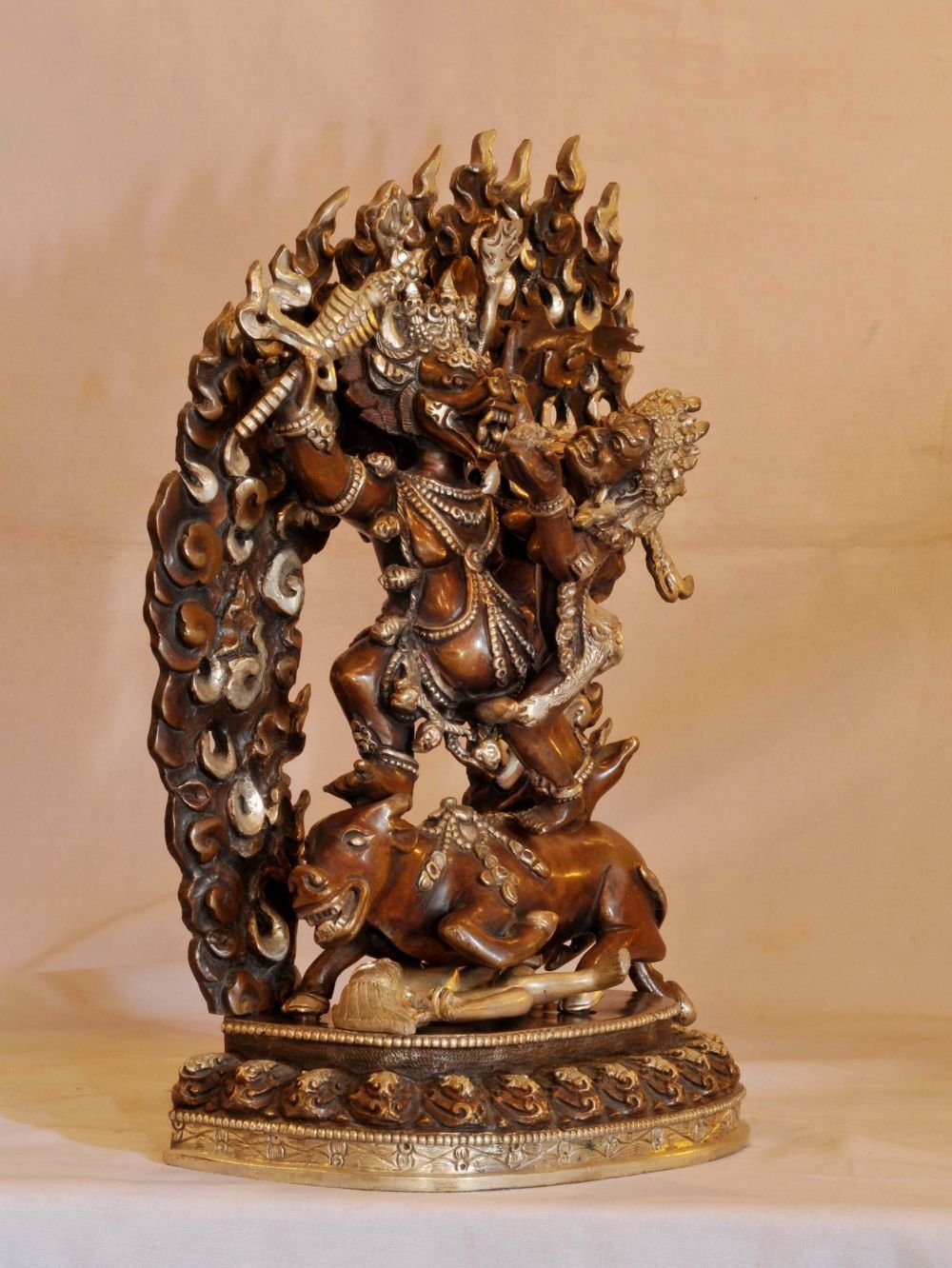 The face of Yamantaka is painted with gold to enhance its significant features, particularly the eyes, and lips. This detailed painting is essential as it brings forth the crucial attributes of the expression of eyes and lips that metal carving alone cannot capture.