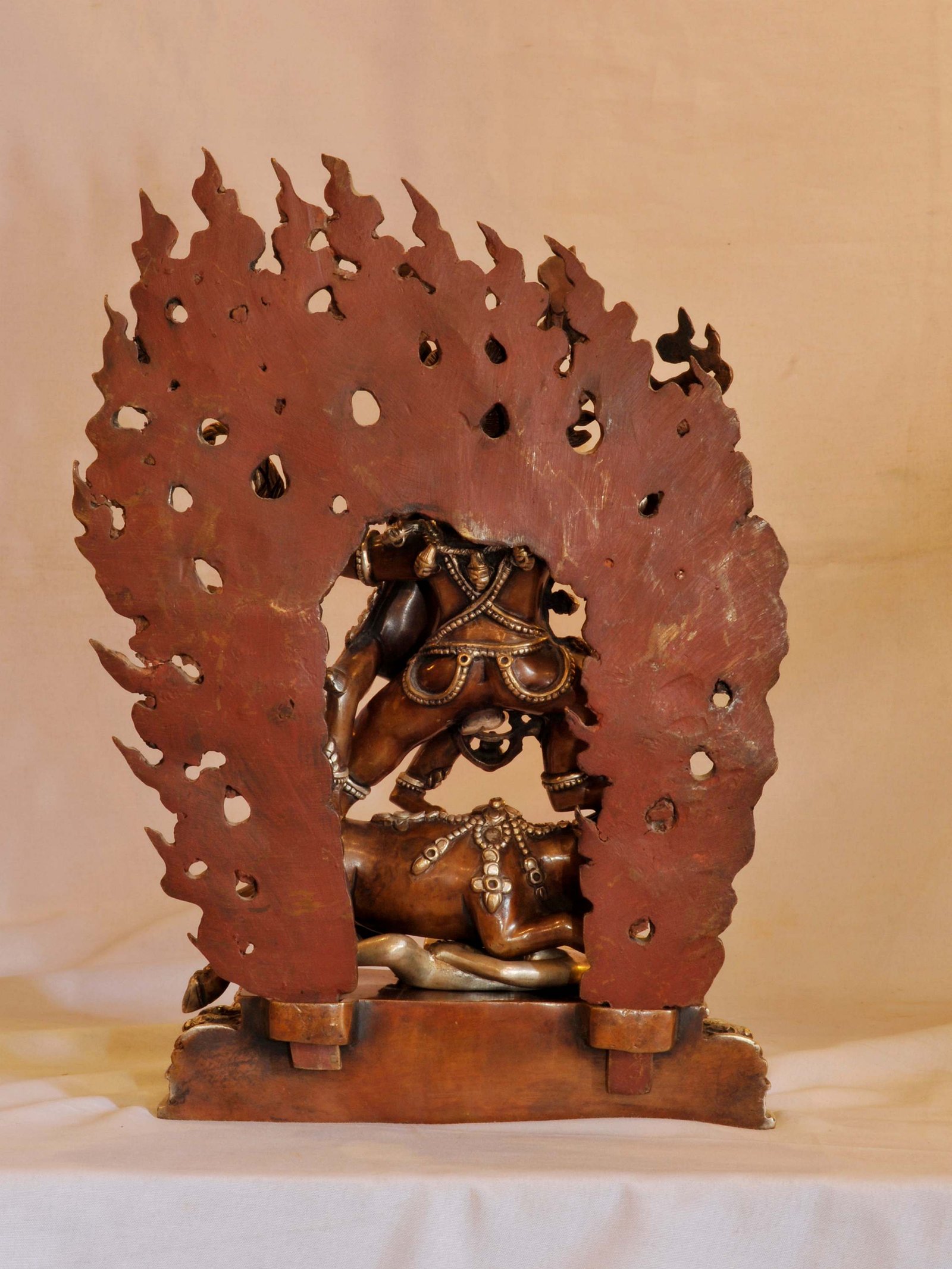 : IntroductionShakti Yab-yum is a common symbol in Nepalese and Tibetan art. It represents the primordial union of wisdom and compassion, depicted as a male deity in union with his female consort via the similar concept of interpenetration or "coalescence," as illustrated by the concept of Indra's net. The male figure represents compassion and dexterity, while the female figure represents insight. The female is seated on the male's lap in yab-yum. A rare rendition of a similar figure, but reversed, with the male sitting on the female's lap, is known as yum-yab. Read More