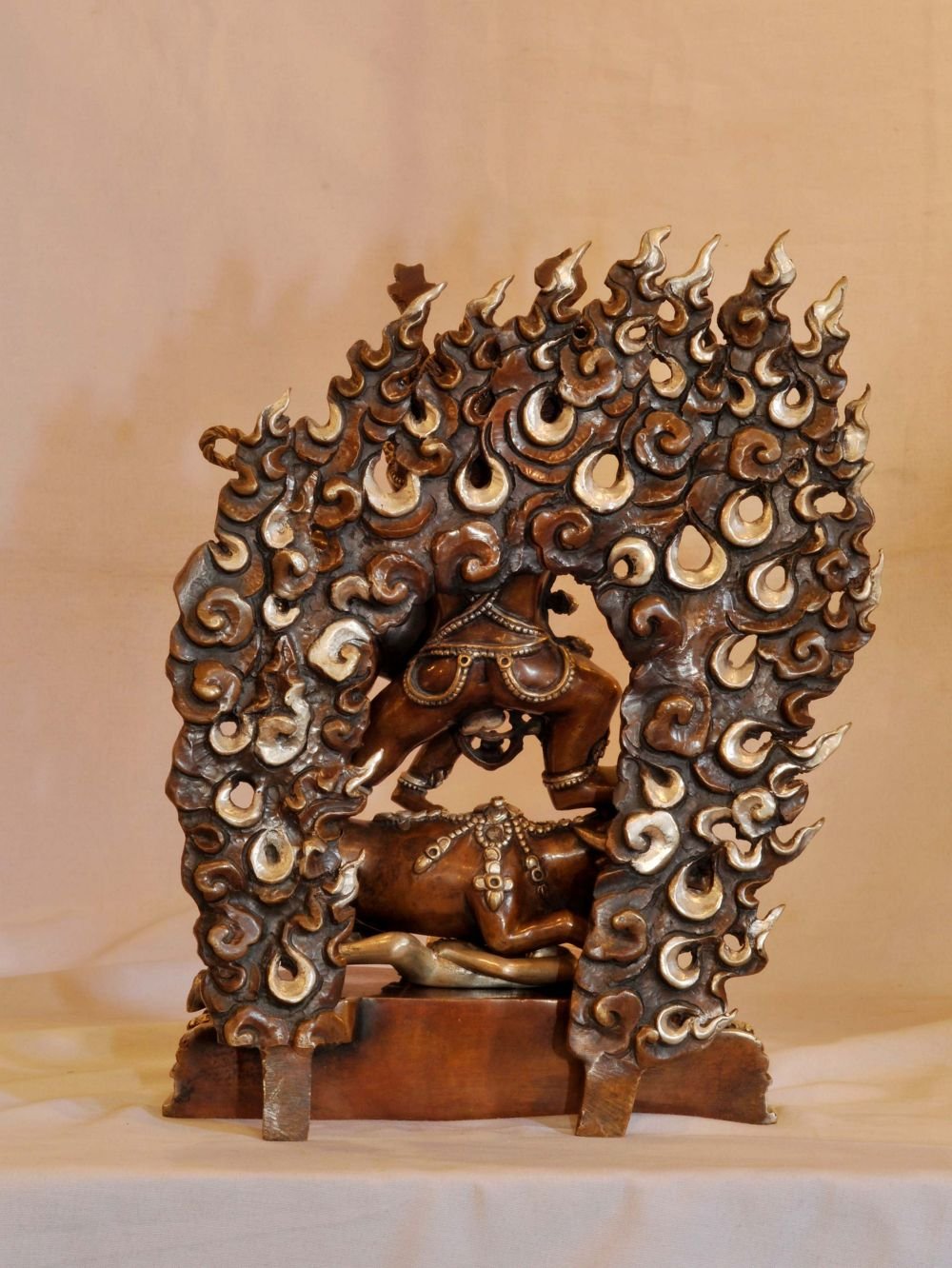 This Yamantaka is made by the process of the Lost-Wax system. The lost-wax process, also known as investment casting, is a time-honored technique used to create metal sculptures. It involves several steps that have been practiced for thousands of years. Skilled artisans begin by sculpting a detailed wax model, capturing every intricate detail of the desired sculpture. The wax model is then coated with a ceramic shell, formed by multiple layers of ceramic material. Once the shell has cured, the wax is melted and drained out, leaving behind a cavity. Molten metal is poured into the cavity, creating a precise replica of the original wax model. After the metal has cooled and solidified, the ceramic shell is carefully removed, revealing the final metal sculpture. Read More