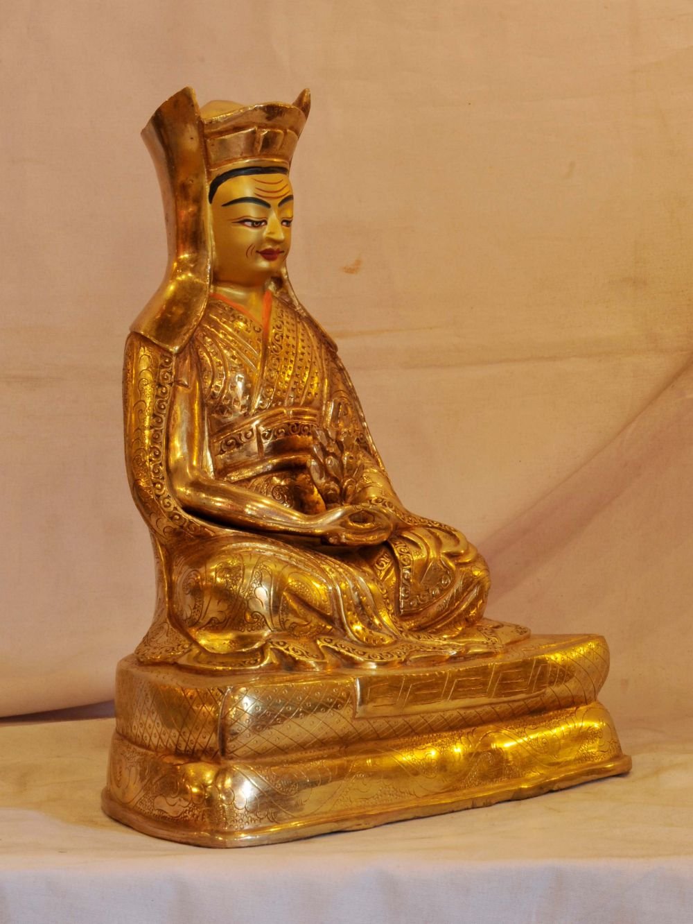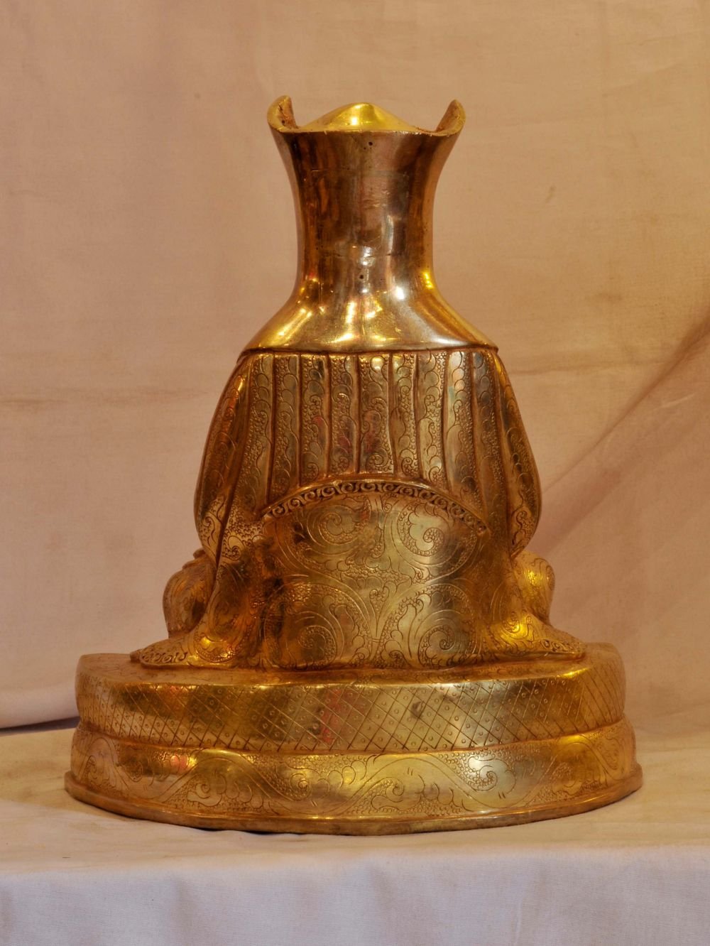 This Gampopa is finished with full gold plating. also known as mercury gold plating or fire gold plating. This traditional technique involves the application of a genuine layer of gold onto the Gampopa. Referred to as mercury gold plating, it is considered the correct and authentic form of gold plating in Nepal. Despite being more expensive than electroplating, this traditional mercury gold plating is gaining popularity again in Nepal. People are drawn to its authenticity, longevity, and the unmatched beauty it brings to the Gampopa. The resurgence of interest in this traditional form of gold plating reflects a growing appreciation for the craftsmanship and cultural heritage of Nepal Read More