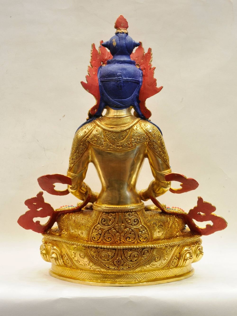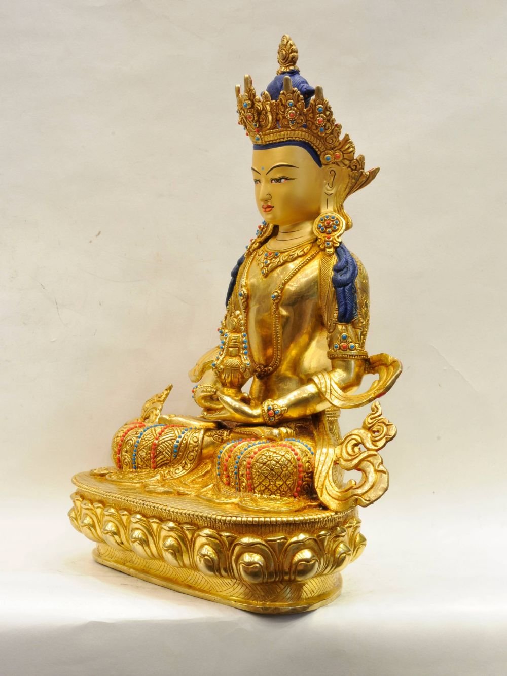 Buddhist Handmade Statue of Aparimita, Full Fire Gold Plated, Face Painted, Stone Setting, Amitayus, Chepame , Buddha of Long Life, Wisdom, and Spiritual Vitality