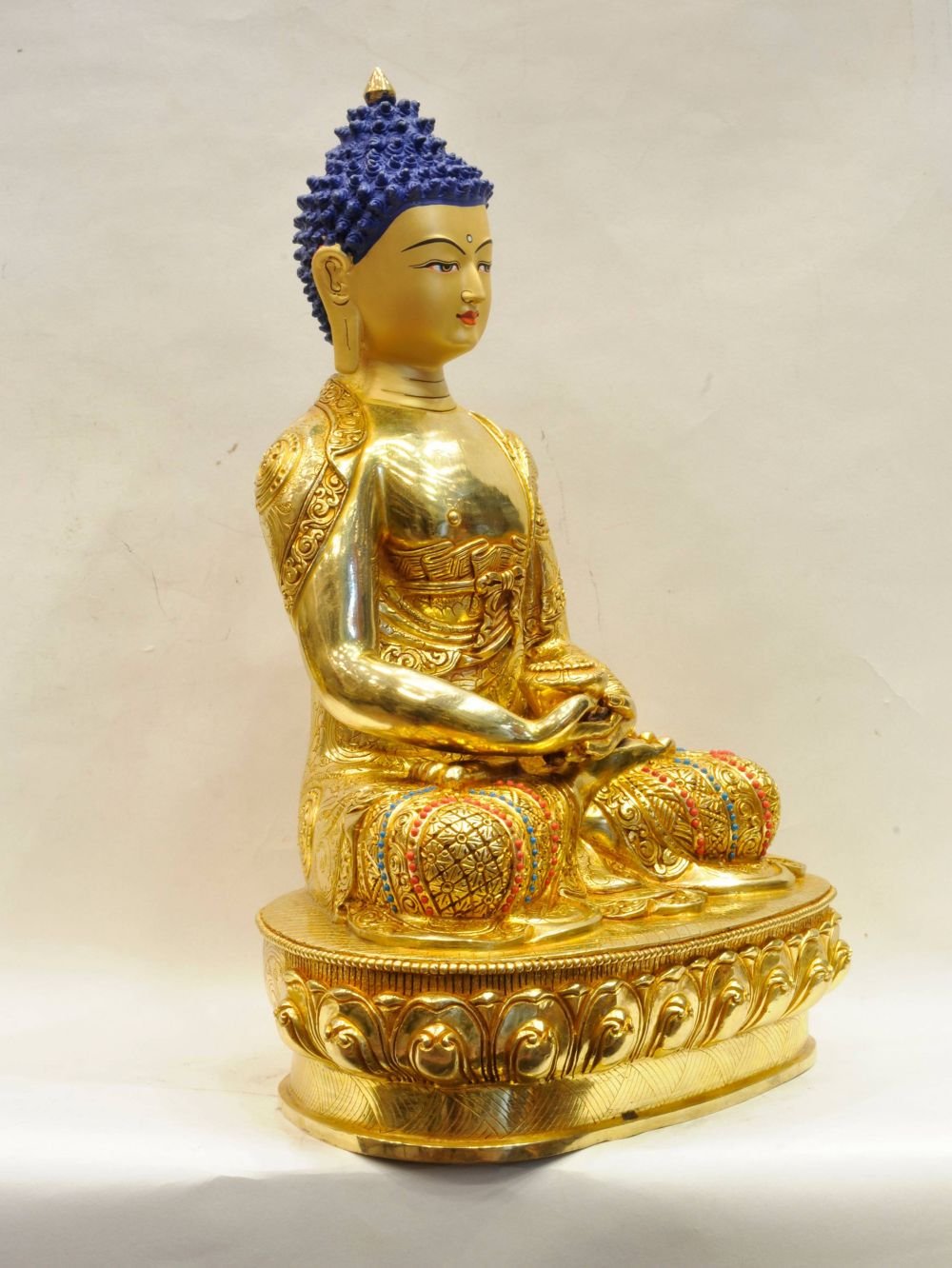 This Amitabha Buddha is finished with full gold plating. also known as mercury gold plating or fire gold plating. This traditional technique involves the application of a genuine layer of gold onto the Amitabha Buddha. Referred to as mercury gold plating, it is considered the correct and authentic form of gold plating in Nepal. Despite being more expensive than electroplating, this traditional mercury gold plating is gaining popularity again in Nepal. People are drawn to its authenticity, longevity, and the unmatched beauty it brings to the Amitabha Buddha. The resurgence of interest in this traditional form of gold plating reflects a growing appreciation for the craftsmanship and cultural heritage of Nepal Read More
