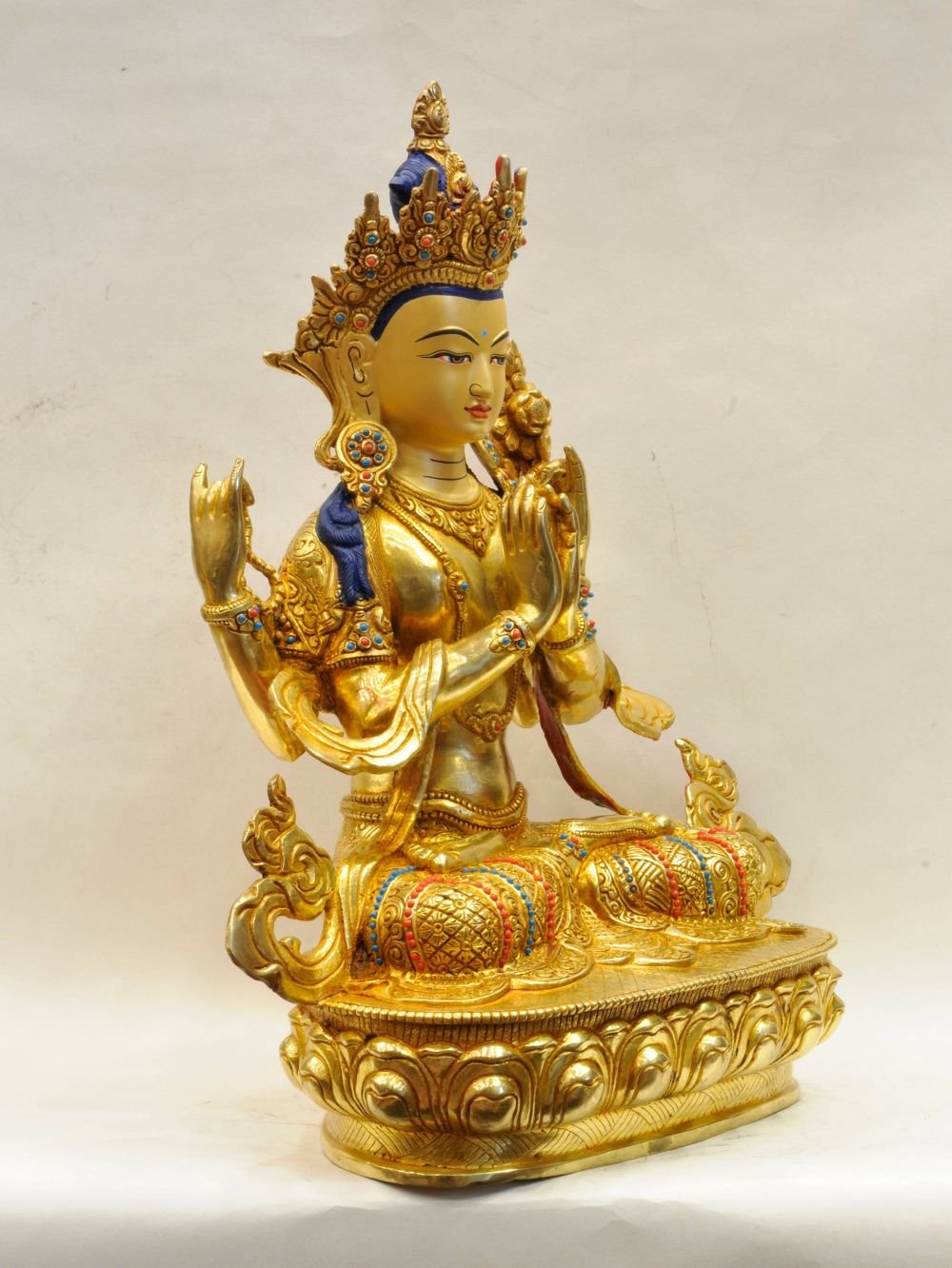 Buddhist Handmade Statue of Chenrezig, Full Fire Gold Plated, Face Painted, Stone Setting , Bodhisattva of Compassion, Protector of All Beings