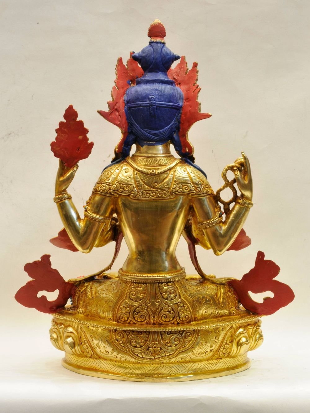 This Chenrezig is finished with full gold plating. also known as mercury gold plating or fire gold plating. This traditional technique involves the application of a genuine layer of gold onto the Chenrezig. Referred to as mercury gold plating, it is considered the correct and authentic form of gold plating in Nepal. Despite being more expensive than electroplating, this traditional mercury gold plating is gaining popularity again in Nepal. People are drawn to its authenticity, longevity, and the unmatched beauty it brings to the Chenrezig. The resurgence of interest in this traditional form of gold plating reflects a growing appreciation for the craftsmanship and cultural heritage of Nepal Read More