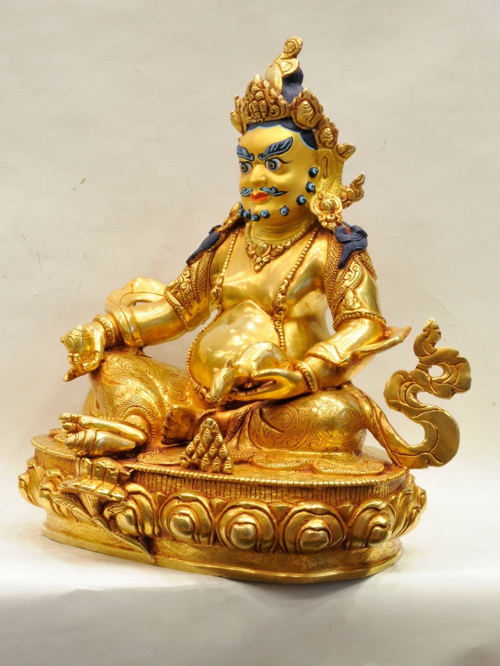 The face of Yellow Jambhala is painted with gold to enhance its significant features, particularly the eyes, and lips. This detailed painting is essential as it brings forth the crucial attributes of the expression of eyes and lips that metal carving alone cannot capture.