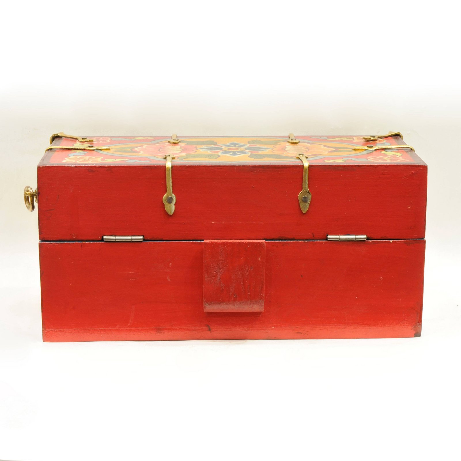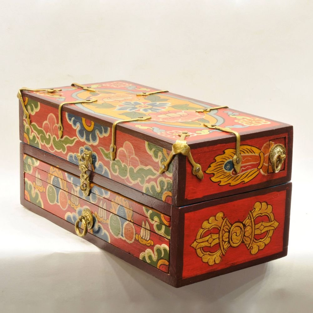 Buddhist Handmade Wooden Traveling Altar Box, Foldable, Double Dorje Design, Traditional Color Painted |