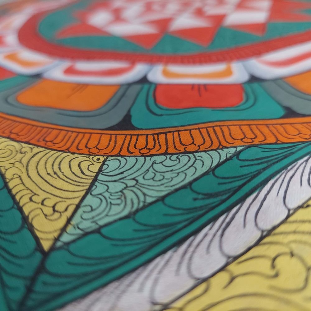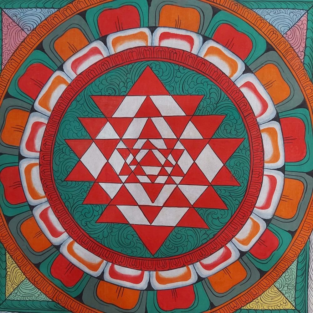 This Sri Yantra is a newari thangka or Paubaha, Paubha, also known as "paubhas," is a traditional religious painting created by the Newar people of Nepal. These exquisite artworks depict various subjects, including deities, mandalas, and monuments, and serve as aids for meditation and spiritual practices. Paubhas are similar to Tibetan Thangka paintings and are highly regarded for their religious and cultural significance.