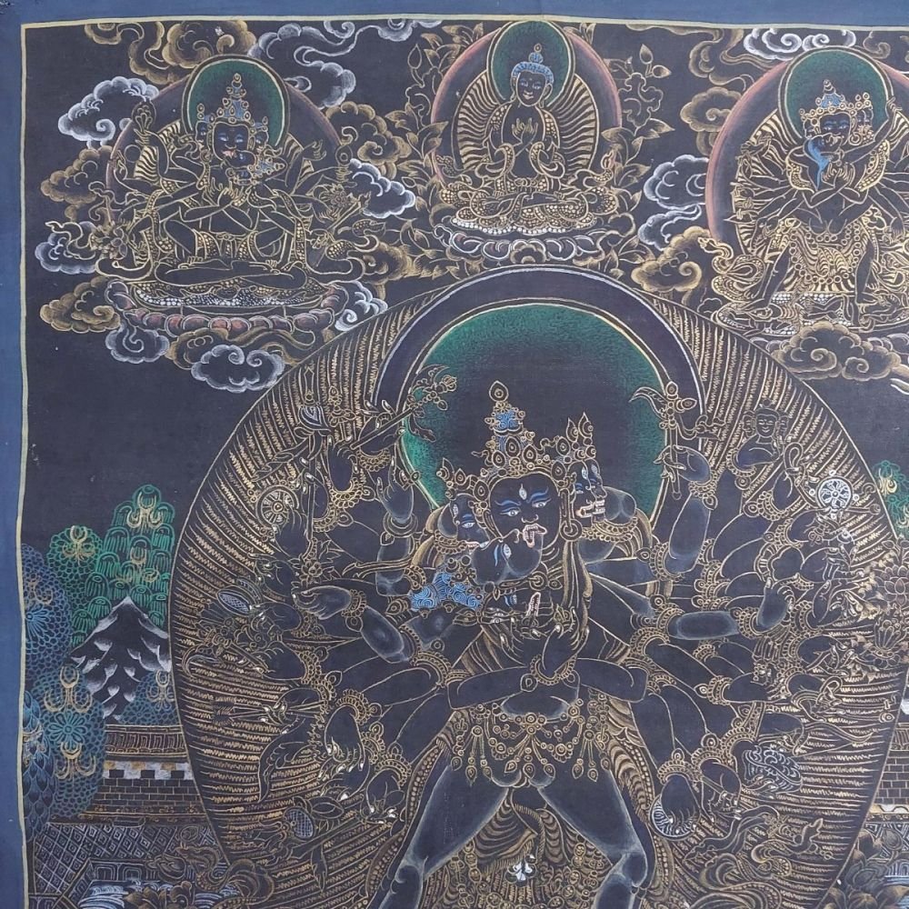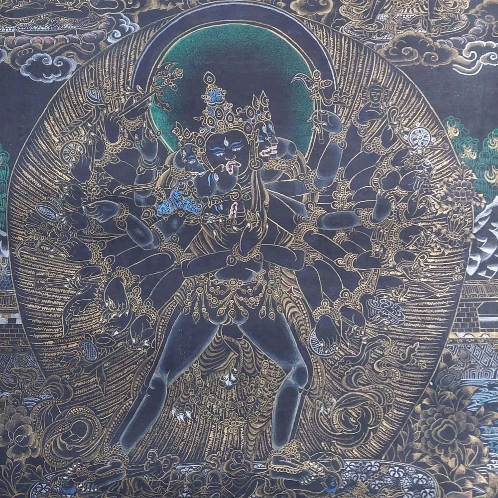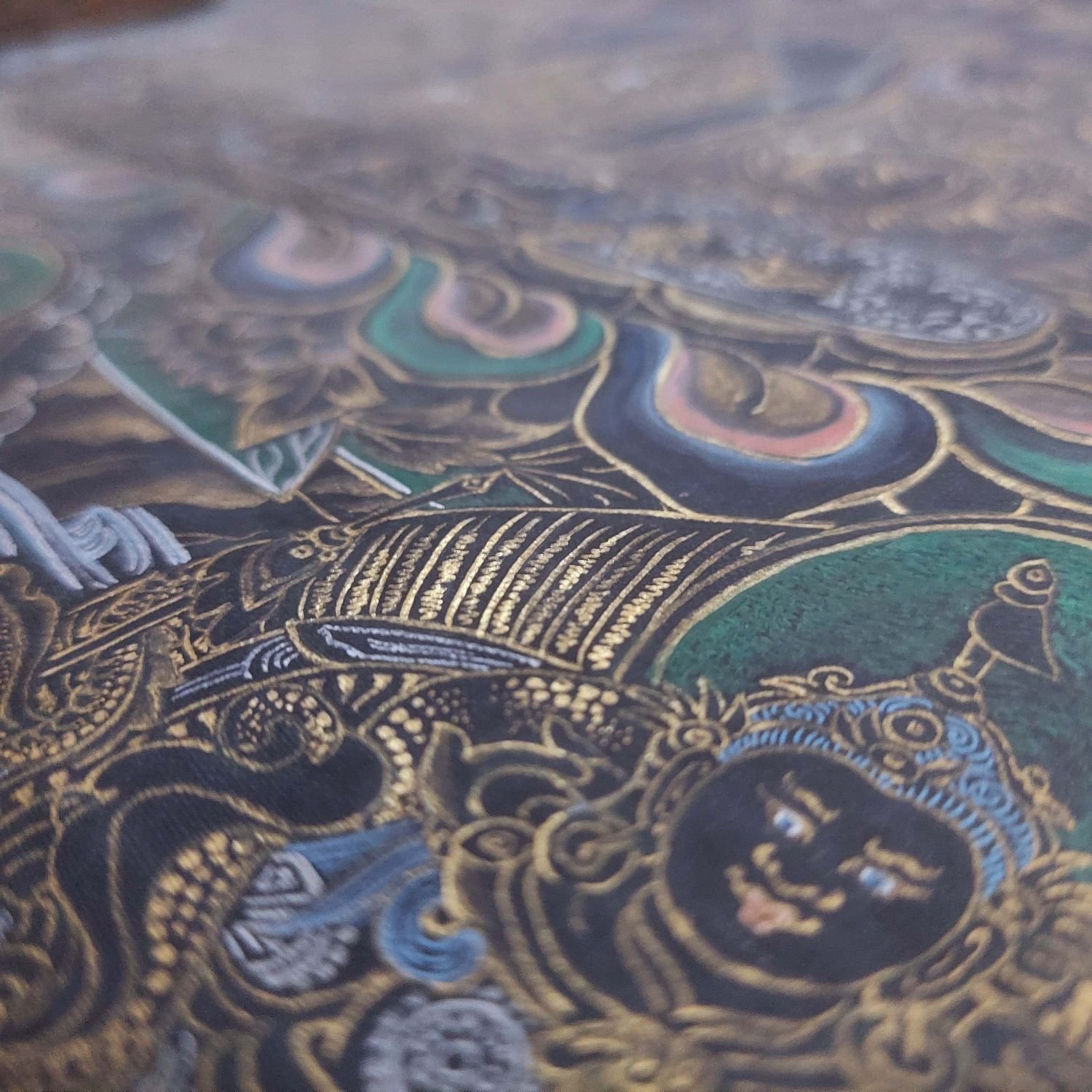This thangka of Kalachakra has real gold painted on its surface along with other paints. This is an ancient process of decorating the thangka in Tibetan Buddhism, Here gold is ground into gold dust, which is then mixed with other undisclosed material to make it paintable on the canvas. this mixture is then mixed with transparent glue and painted on the thangka. Read More