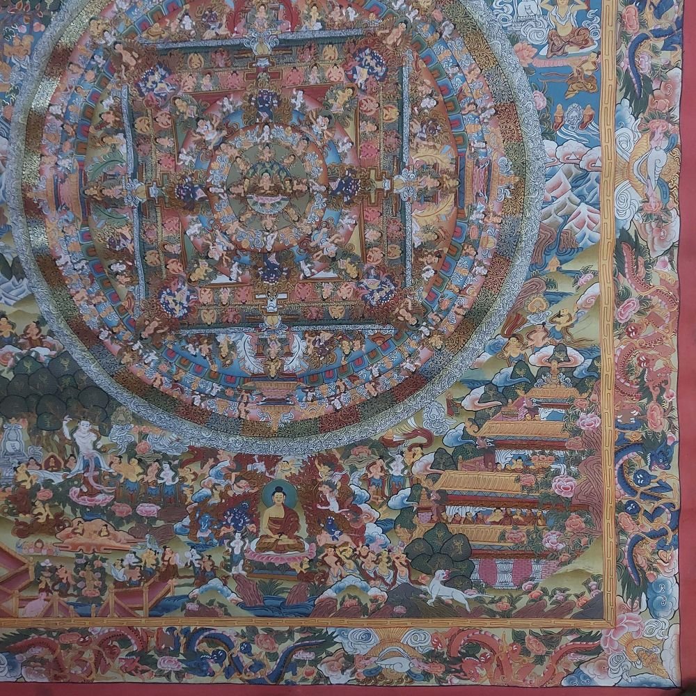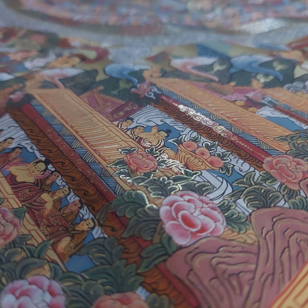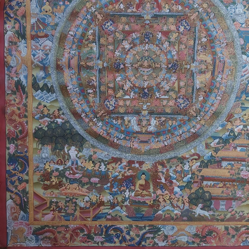 This thangka of Mandala has real gold painted on its surface along with other paints. This is an ancient process of decorating the thangka in Tibetan Buddhism, Here gold is ground into gold dust, which is then mixed with other undisclosed material to make it paintable on the canvas. this mixture is then mixed with transparent glue and painted on the thangka. Read More