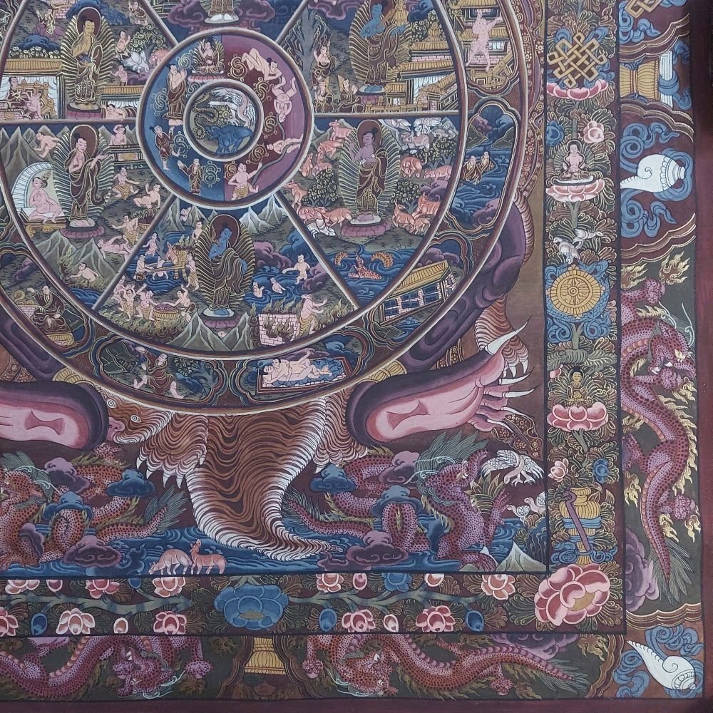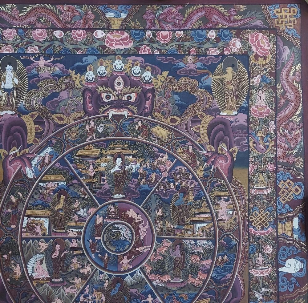The outer rim of the wheel is divided into twelve sections that represent the Twelve Links of Dependent Origination.