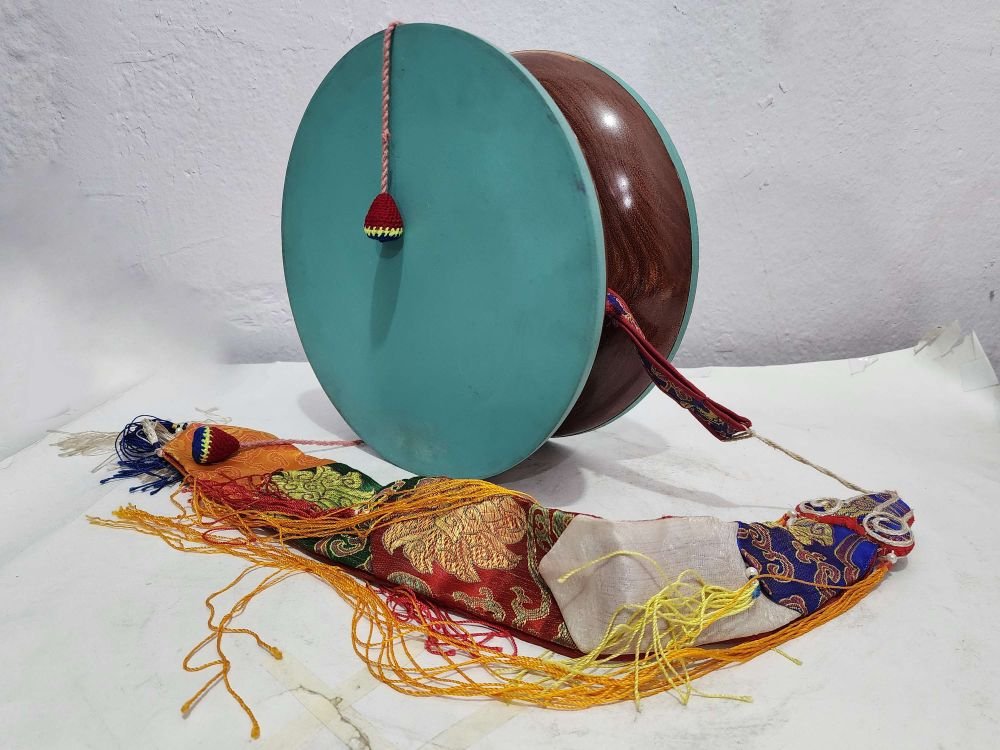 Chod Damaru, High Quality Rose Wood Bhutanese Chod Damaru, with Brocade Cover and Tail , symbolizing the sound of creation and the rhythm of the universe