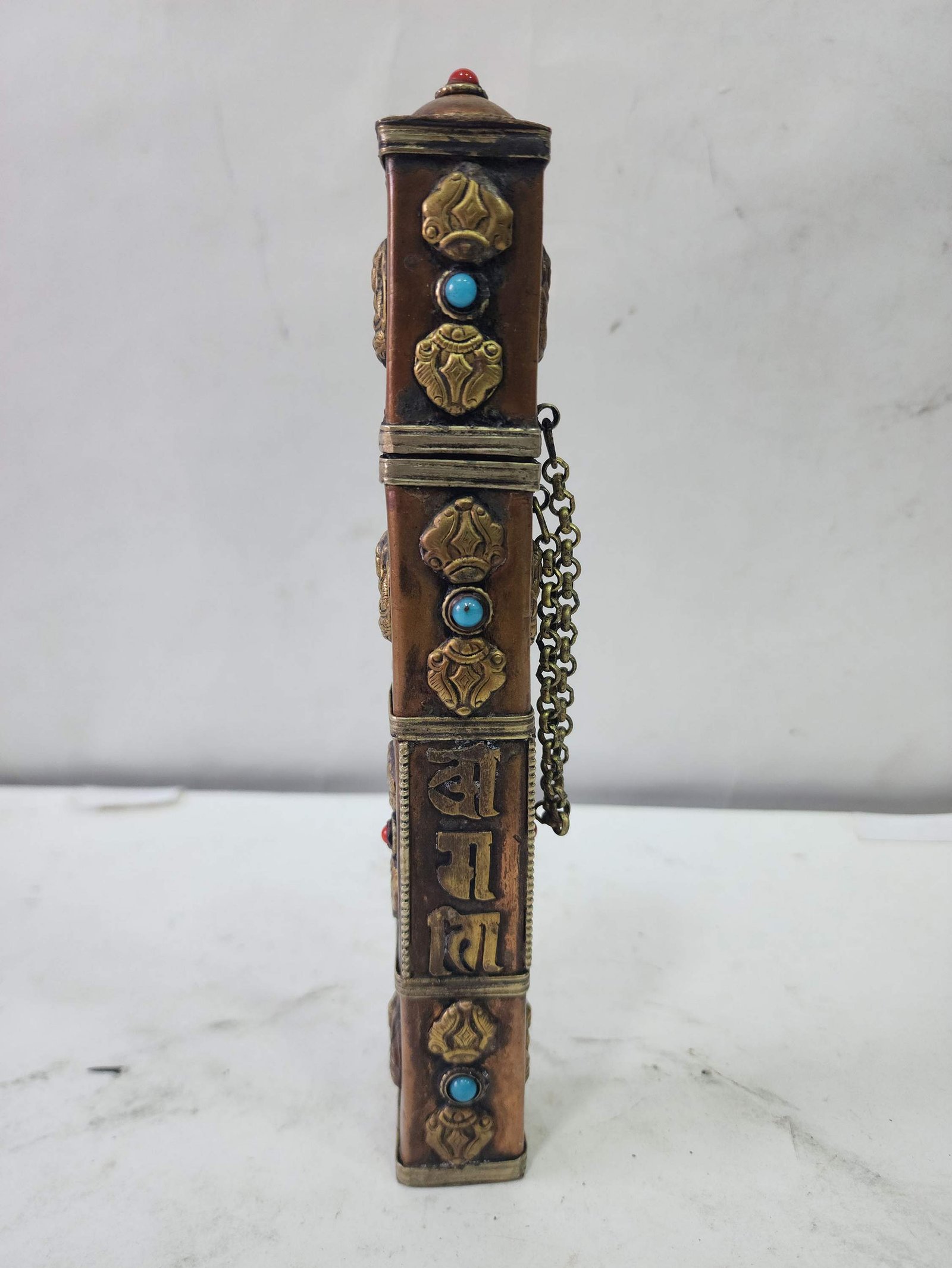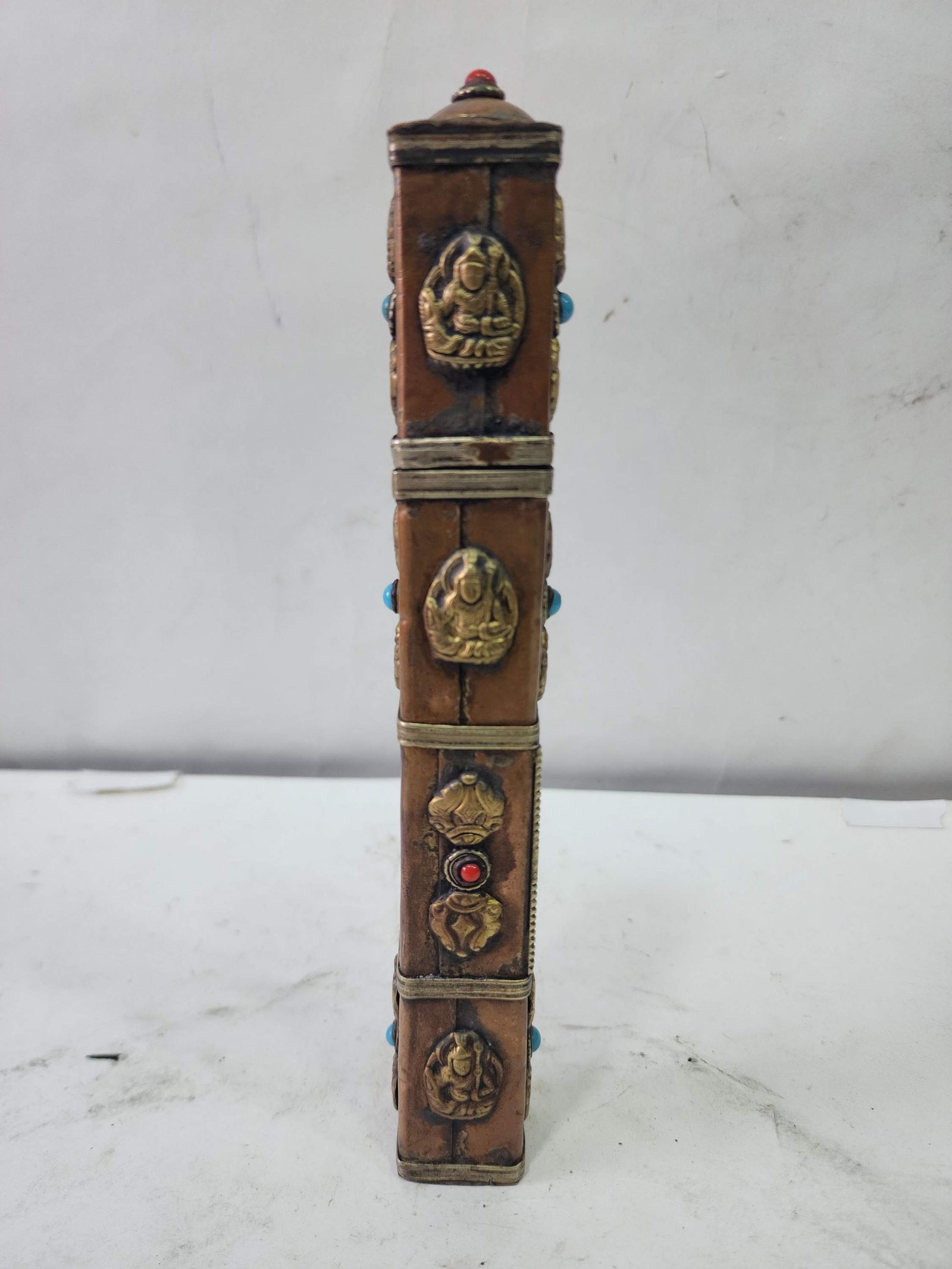The Incense Holder is adorned with an exquisite array of semi-precious stones, including turquoise, coral, and lapis lazuli. These stones are carefully selected and meticulously placed on the Incense Holder's surface, adding a touch of opulence and enhancing its overall beauty. Each stone is thoughtfully positioned using a high-quality adhesive, ensuring secure and long-lasting attachment. The vibrant colors and unique patterns of the stones create a captivating contrast against the backdrop of the Incense Holder, elevating its visual appeal and making it truly eye-catching. Read More
