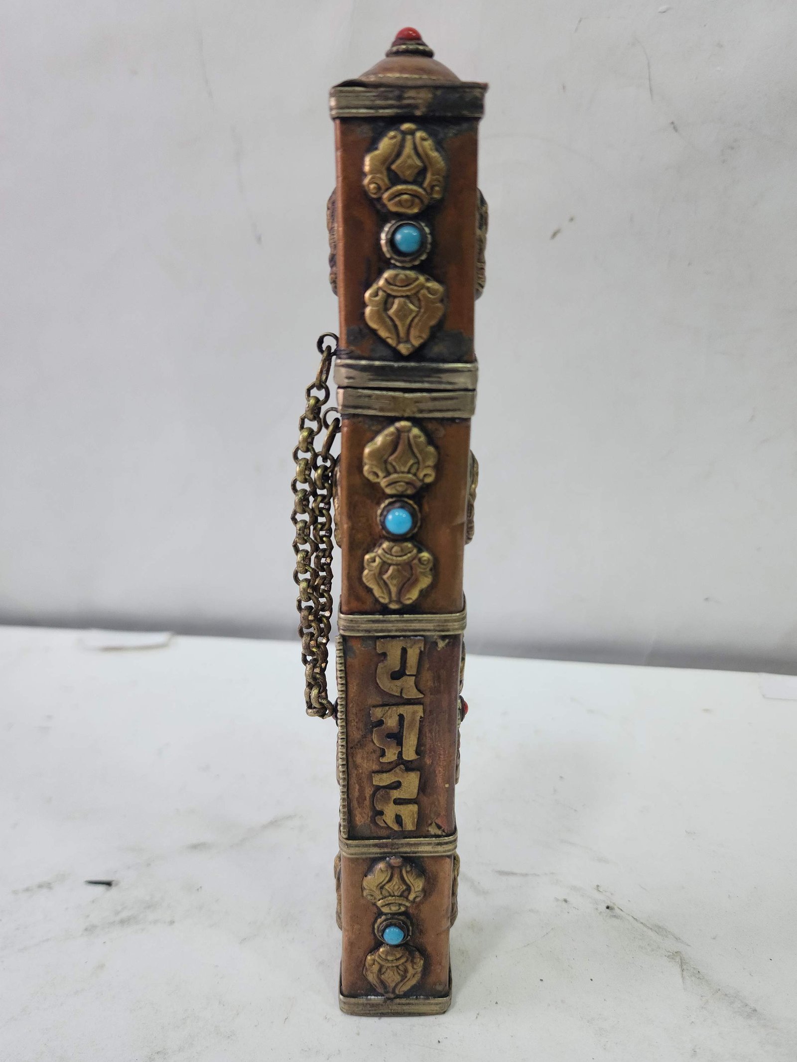 Hand Beaten Metal Incense Holder, Ashtamangala, Stone Setting |