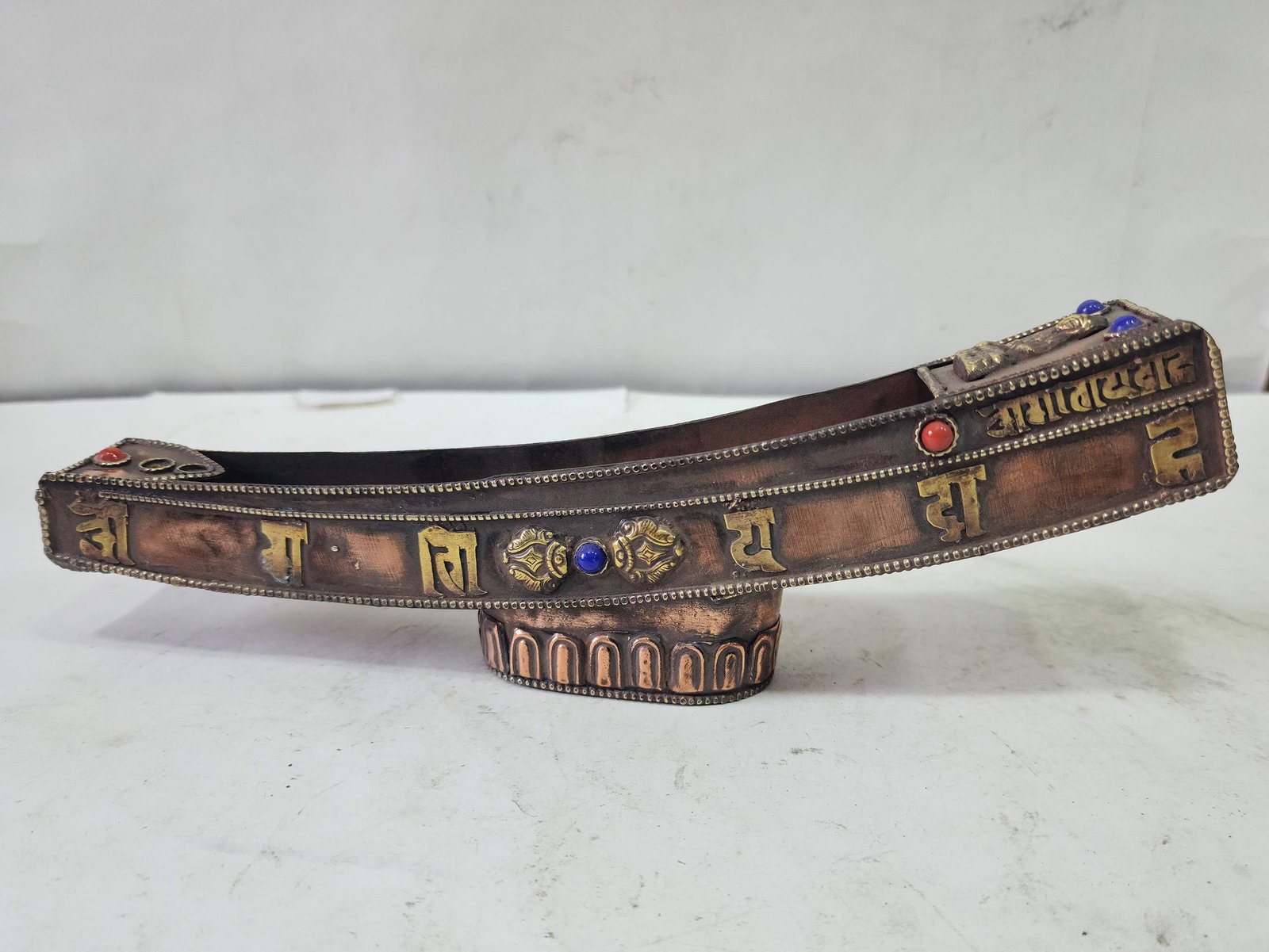 Hand Beaten Metal Incense Burner Stand with Ashtamangala, Stone Setting , Used to purify the surroundings, symbolizing devotion and the sacred nature of offerings