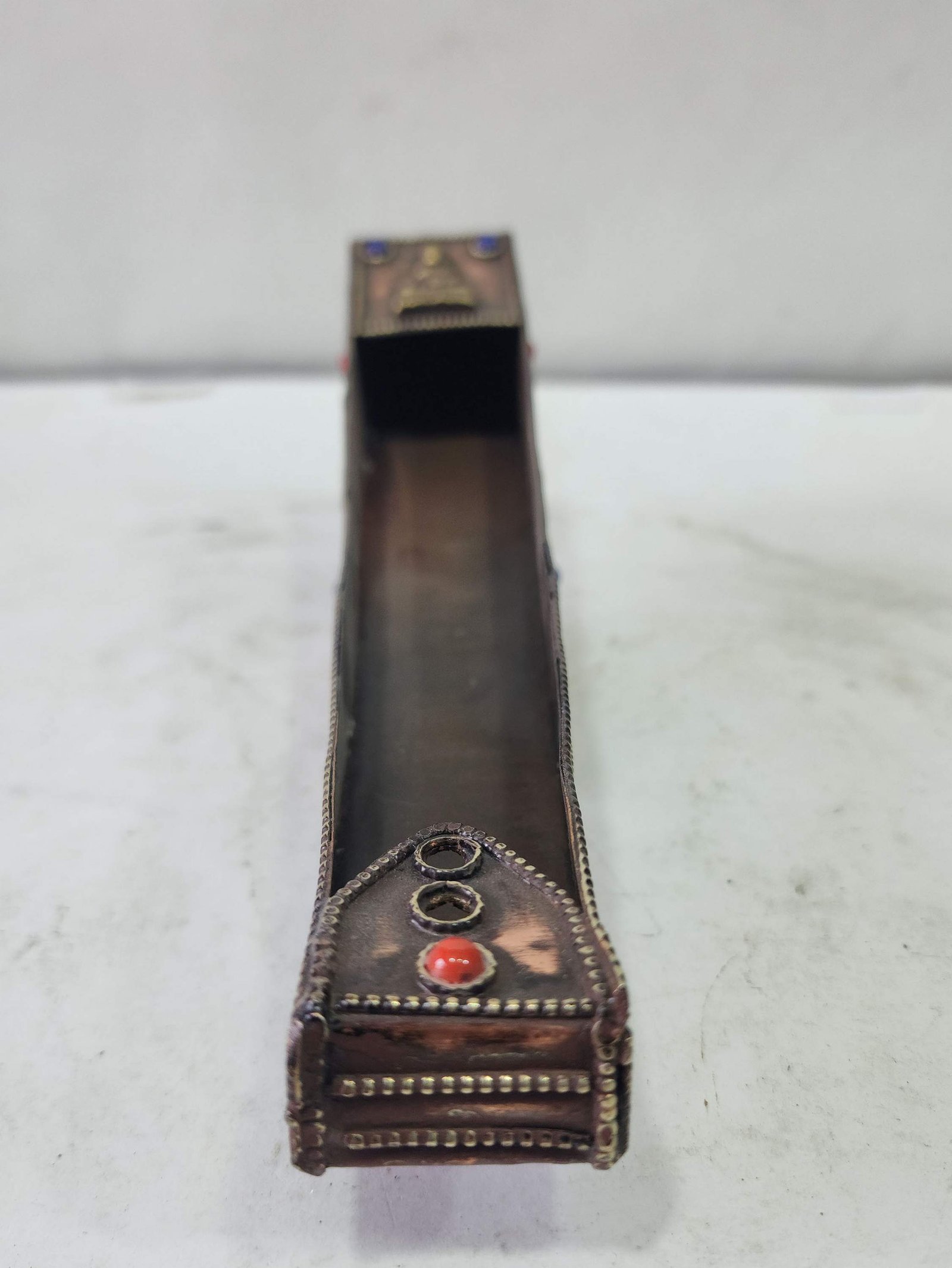 The Incense Burner is adorned with an exquisite array of semi-precious stones, including turquoise, coral, and lapis lazuli. These stones are carefully selected and meticulously placed on the Incense Burner's surface, adding a touch of opulence and enhancing its overall beauty. Each stone is thoughtfully positioned using a high-quality adhesive, ensuring secure and long-lasting attachment. The vibrant colors and unique patterns of the stones create a captivating contrast against the backdrop of the Incense Burner, elevating its visual appeal and making it truly eye-catching. Read More