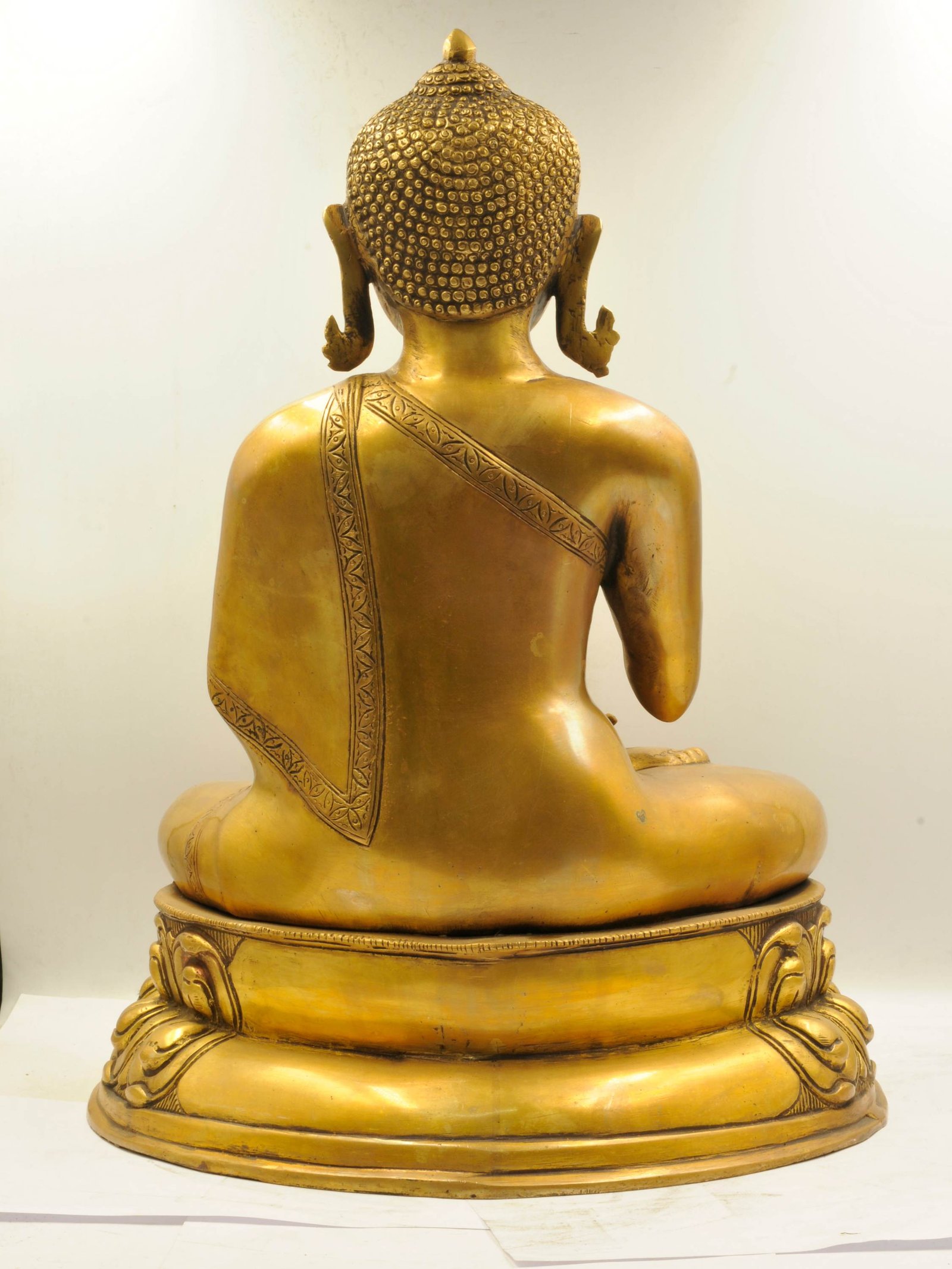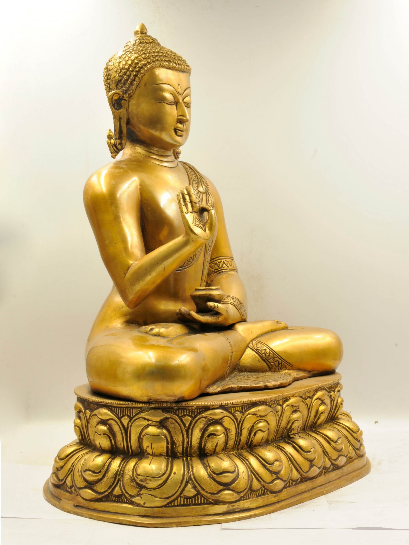 This Amoghasiddhi Buddha has been created using the sand casting system, also known as sand molding casting. This widely employed manufacturing process utilizes a sand mold to produce metal products and components in various sizes and shapes. Sand casting holds significant popularity in the industry, accounting for approximately 60% of all metal castings. The sand casting process involves six primary steps. First, a pattern or replica of the desired sculpture, in this case, Amoghasiddhi Buddha, is created using a material like wood or metal. The pattern is then placed in a flask, which is a box-like structure divided into two halves. The next step involves packing the flask tightly with specially formulated molding sand, creating a mold cavity that matches the shape of the pattern. The pattern is subsequently removed, leaving behind a negative impression of the sculpture within the sand mold. Read More