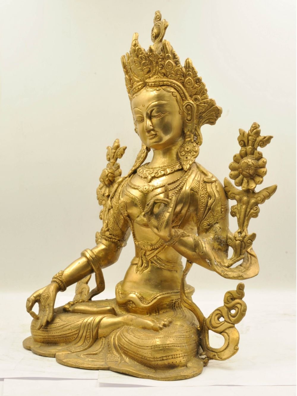 Sita Tara, popularly known as White Tara. She has emanated from Avalokiteshvara & in the Nepali Transcendent Buddha tradition is the consort of Vairochana, the central Transcendent Buddha. Her inner virtue of loving compassion is magnified by the simplicity of her presentation. White Tara is an important Vajrayana Buddhist figure since she embodies the principle of loving kindness, which is the central quality in the altruistic Bodhisattva presented through Mahayana Buddhism. Her main emblem is the Pink Lotus [Skt. Kamala] representing this main quality.