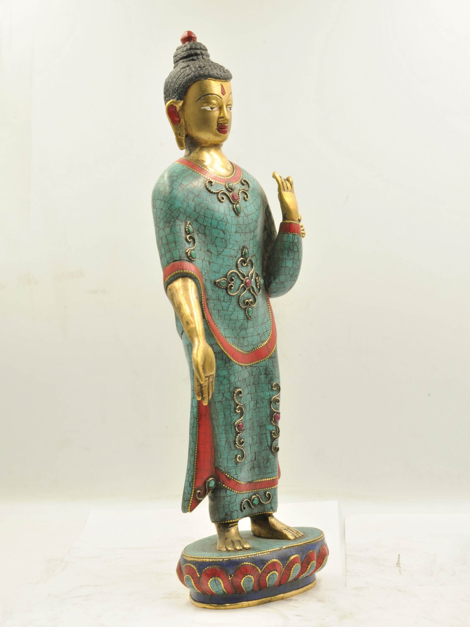 The Dipankara Buddha is adorned with an exquisite array of semi-precious stones, including turquoise, coral, and lapis lazuli. These stones are carefully selected and meticulously placed on the Dipankara Buddha's surface, adding a touch of opulence and enhancing its overall beauty. Each stone is thoughtfully positioned using a high-quality adhesive, ensuring secure and long-lasting attachment. The vibrant colors and unique patterns of the stones create a captivating contrast against the backdrop of the Dipankara Buddha, elevating its visual appeal and making it truly eye-catching. Read More