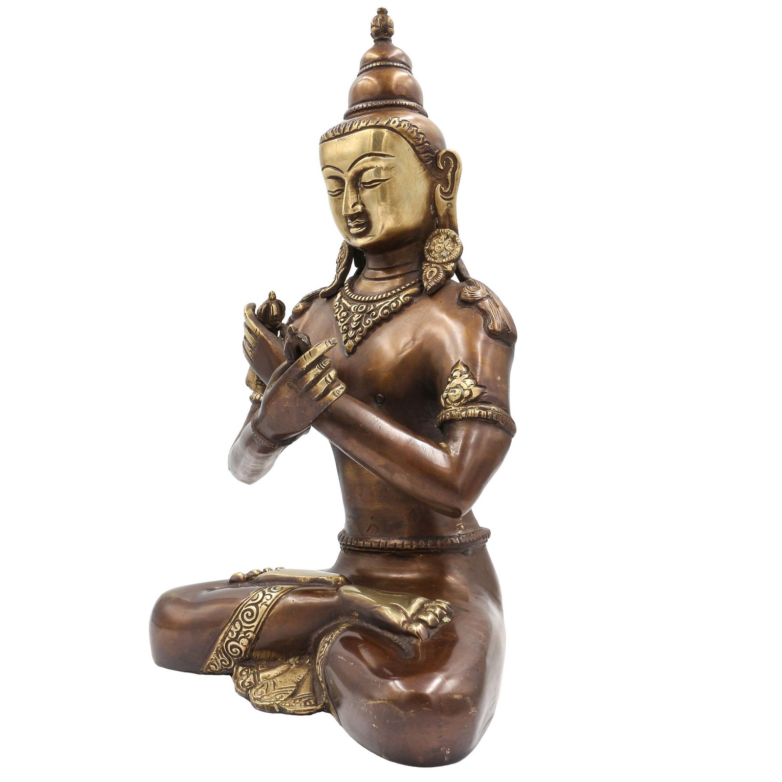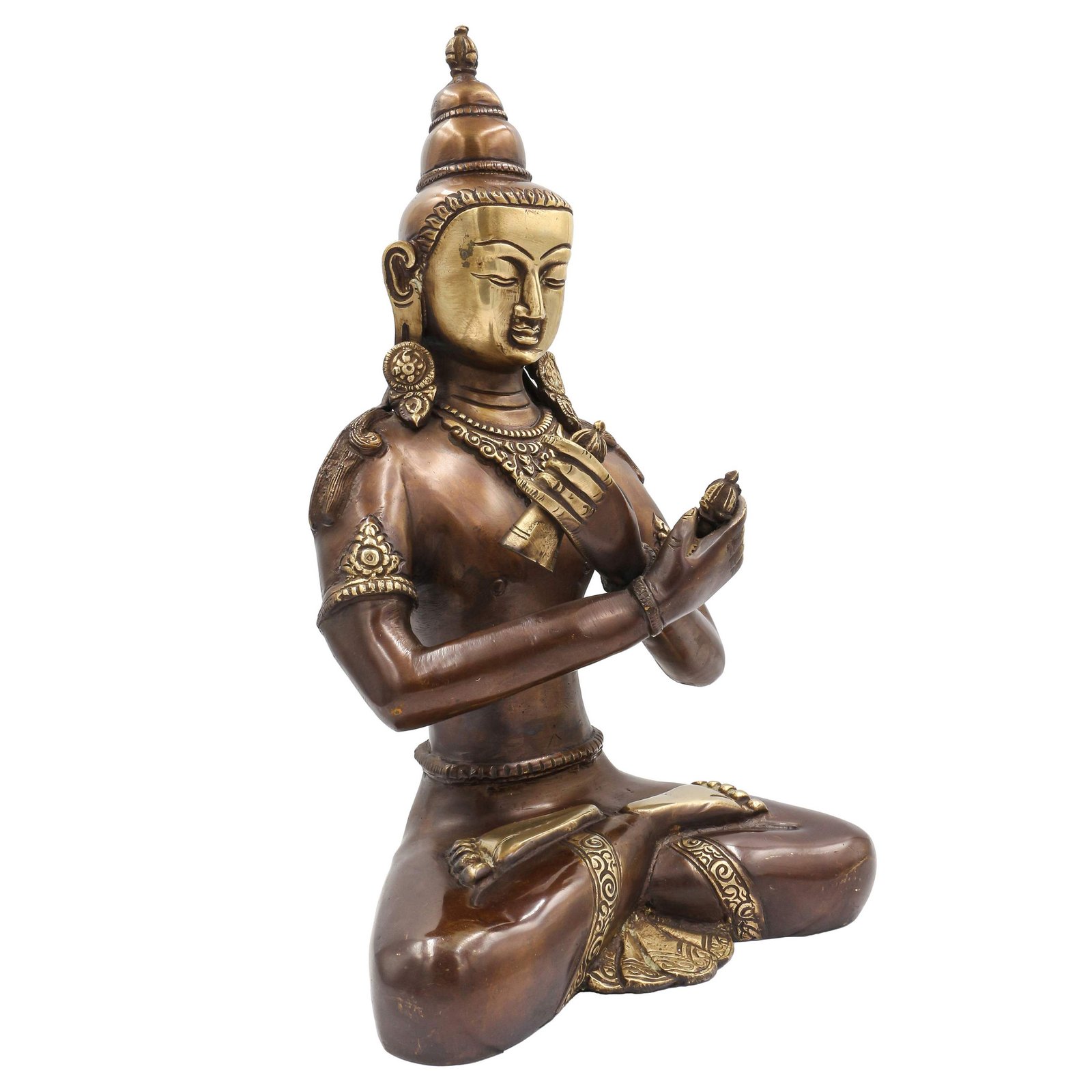 By imitating the natural aging process, the chocolate color antique patina lends an air of authenticity and vintage charm to the Vajradhara. This carefully crafted finish ensures that the patina remains intact for an extended period, offering longevity and resistance to wear. The result is a unique piece that captures the essence of a time-worn copper statue, evoking a sense of history and artistic heritage.