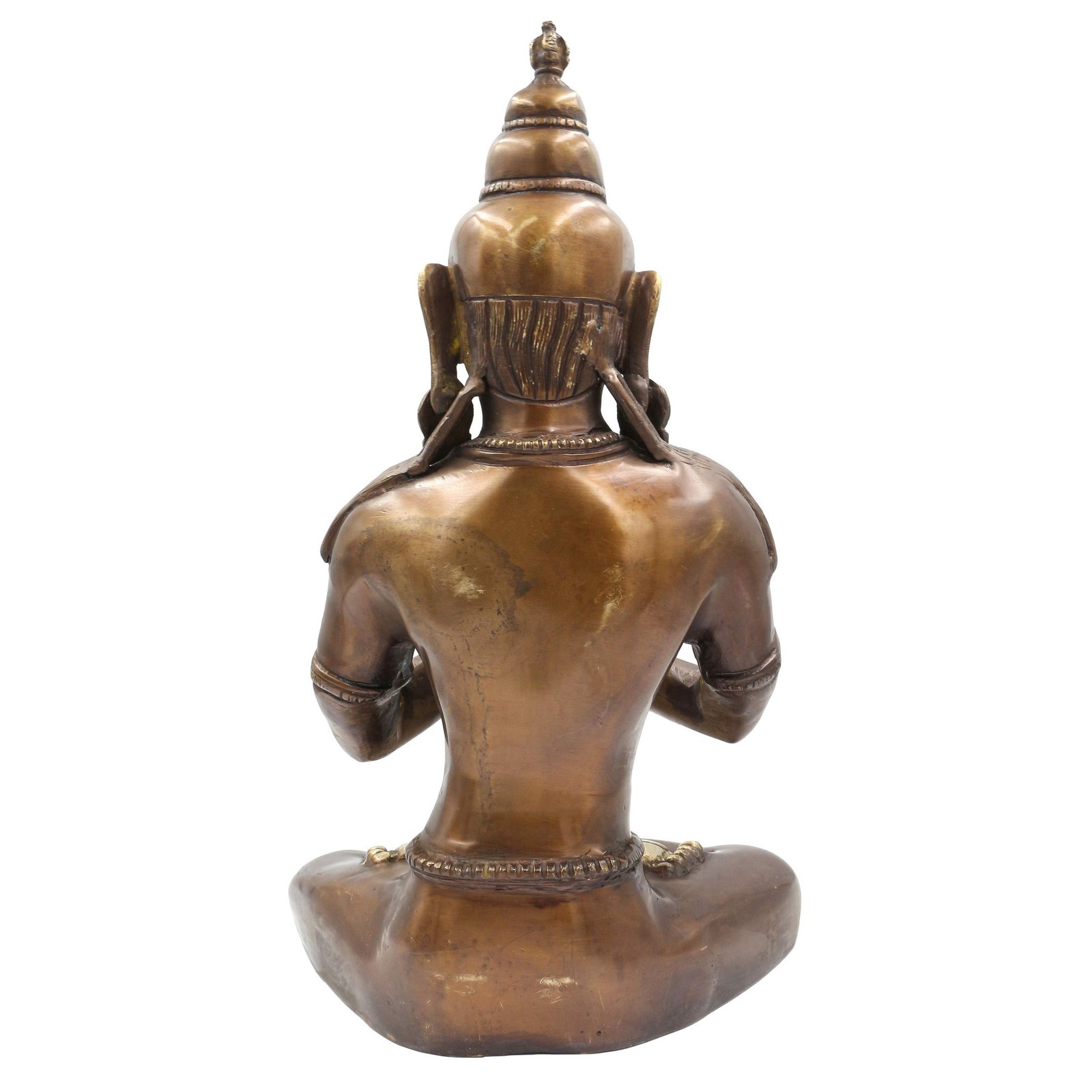 This Vajradhara has been meticulously treated with a chocolate color antique patina. The intention behind this patina is to replicate the appearance of a copper statue that has gracefully aged over a century. Unlike a simple coat of paint, this patina is not applied superficially and is designed to endure. It undergoes an artificial oxidation process that adds depth and character, while also serving as a protective layer against natural oxidation.