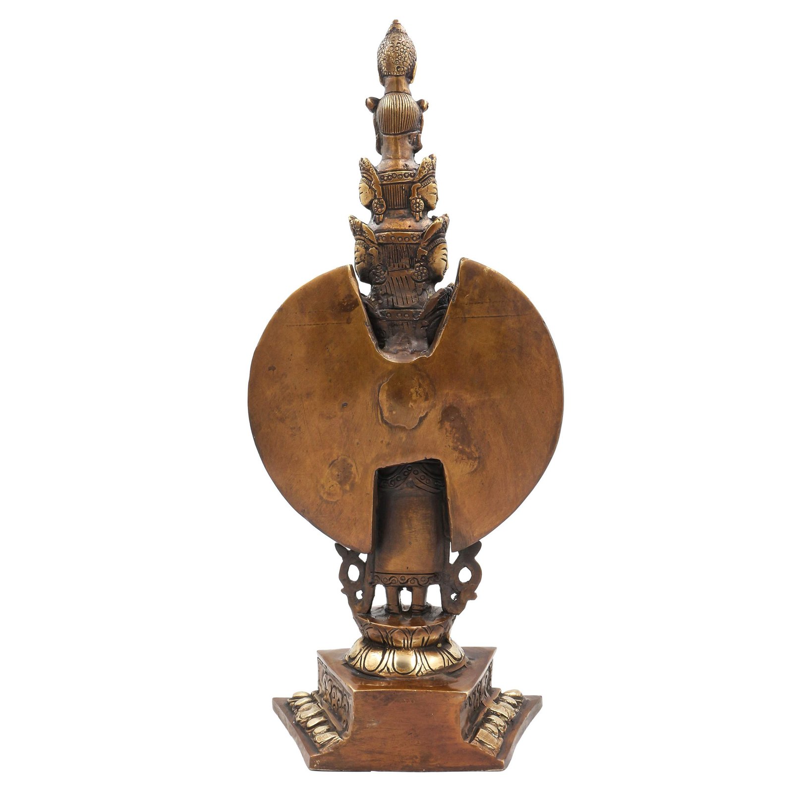 By imitating the natural aging process, the chocolate color antique patina lends an air of authenticity and vintage charm to the Sahasrabhuja Avalokitesvara. This carefully crafted finish ensures that the patina remains intact for an extended period, offering longevity and resistance to wear. The result is a unique piece that captures the essence of a time-worn copper statue, evoking a sense of history and artistic heritage.