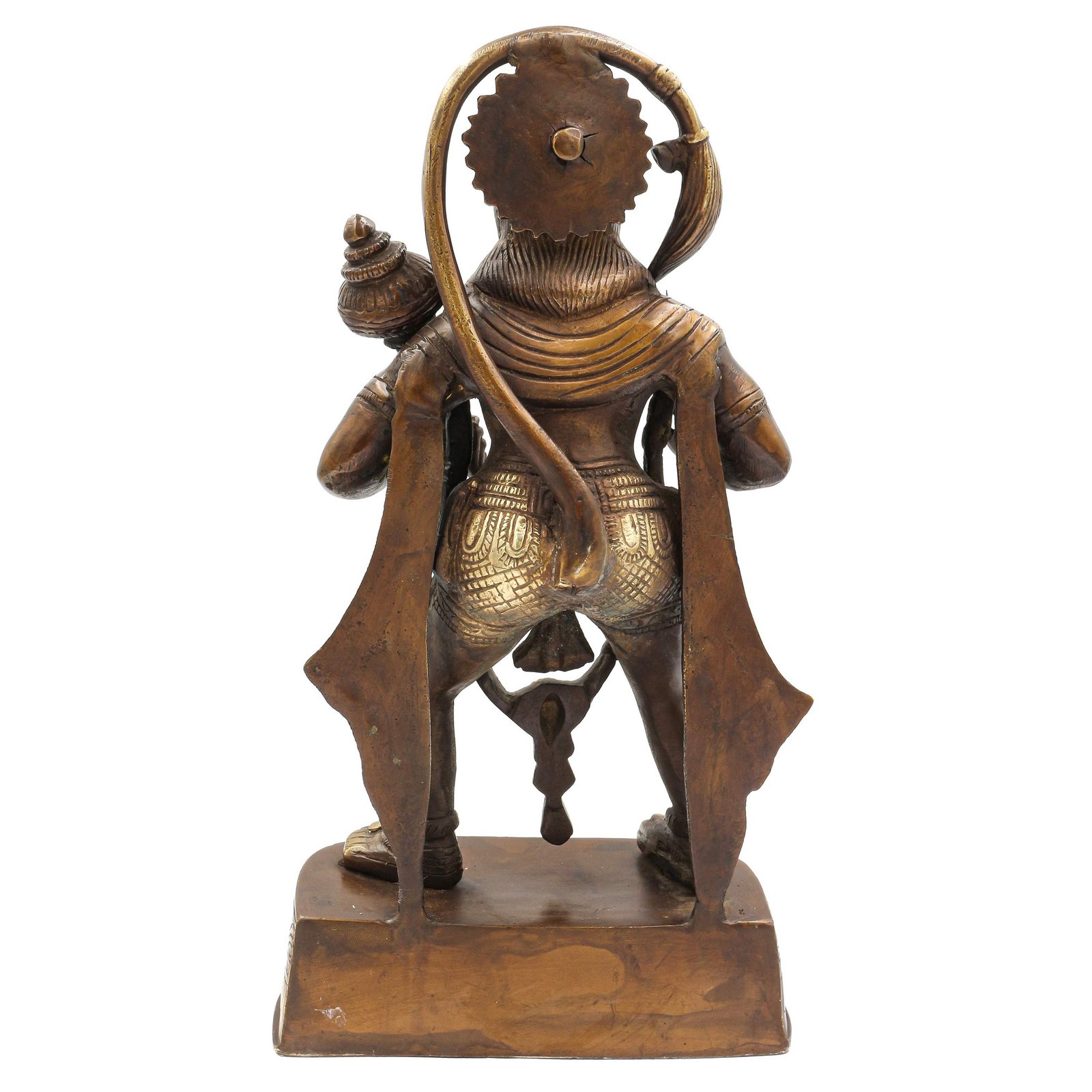 This Hanuman has been meticulously treated with a chocolate color antique patina. The intention behind this patina is to replicate the appearance of a copper statue that has gracefully aged over a century. Unlike a simple coat of paint, this patina is not applied superficially and is designed to endure. It undergoes an artificial oxidation process that adds depth and character, while also serving as a protective layer against natural oxidation.