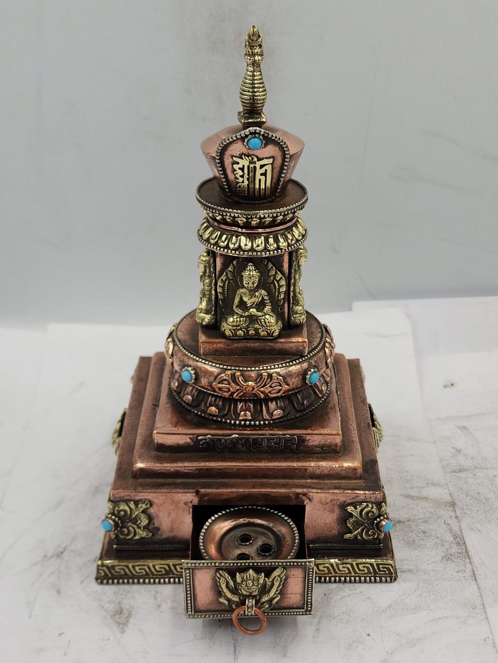 The Stupa is adorned with an exquisite array of semi-precious stones, including turquoise, coral, and lapis lazuli. These stones are carefully selected and meticulously placed on the Stupa's surface, adding a touch of opulence and enhancing its overall beauty. Each stone is thoughtfully positioned using a high-quality adhesive, ensuring secure and long-lasting attachment. The vibrant colors and unique patterns of the stones create a captivating contrast against the backdrop of the Stupa, elevating its visual appeal and making it truly eye-catching. Read More